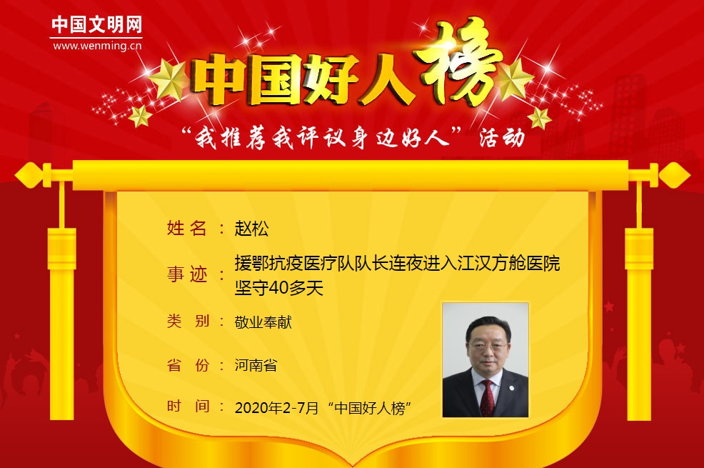 9月17日,由中央文明办主办,中国文明网承办的“我推荐我评议身边好人”活动发布了2020年2-7月“中国好人榜”榜单,德赢AC米兰中国官方网站第一附属医院副院长赵松名列其中 。
