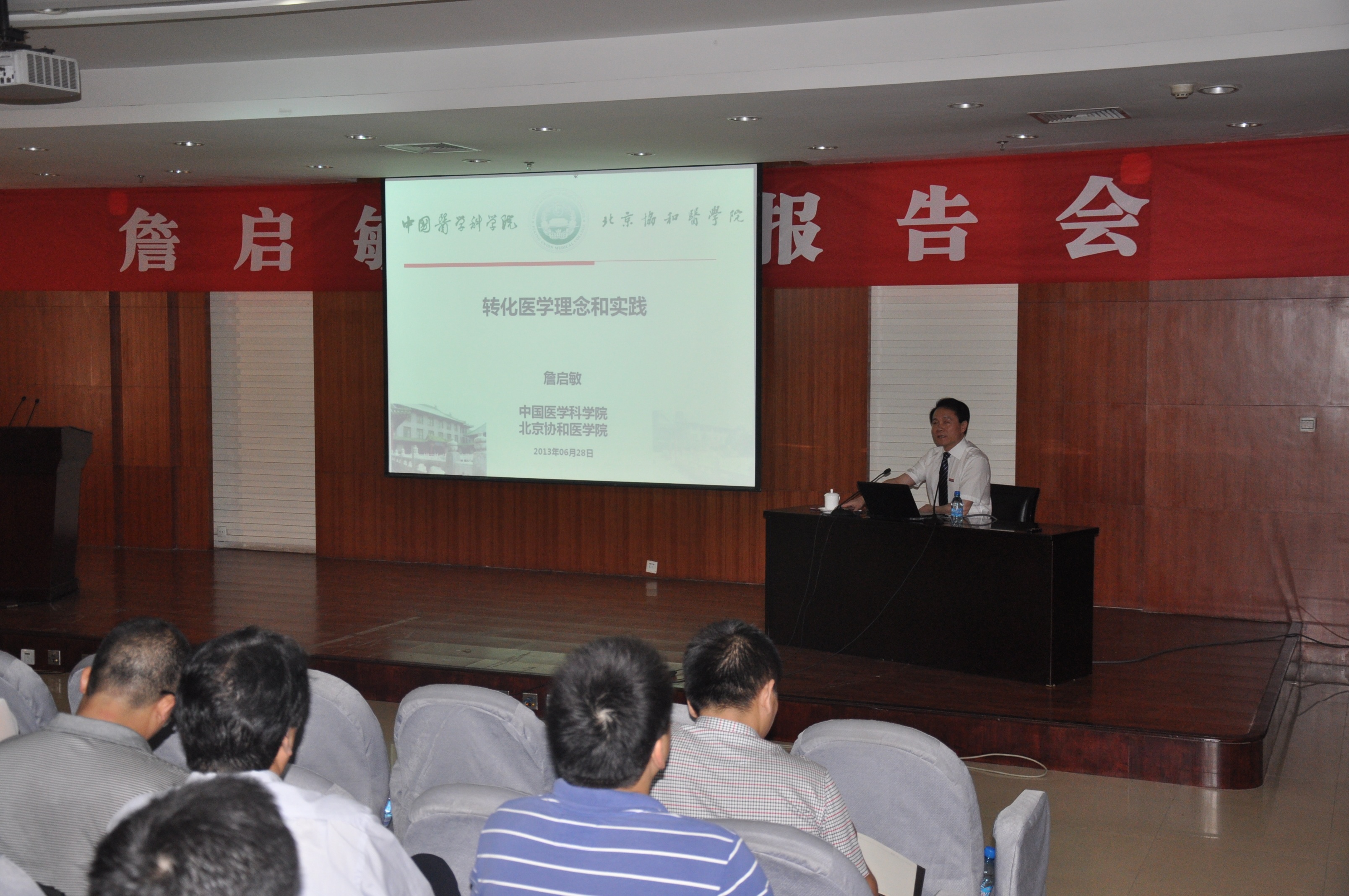聘任仪式结束后,詹院士作了《转化医学发展理念和实践》的专题报告。他站在我国医疗卫生战略发展目标和世界医学科技创新前沿的高度上,结合自己的学术研究,紧紧围绕“转化医学发展”这一主题,深入浅出地从国内外有关的历史背景、医疗卫生工作的地位和作用,国际和国内卫生健康事业比较、临床医学和医院建设发展以及肿瘤学科发展几个层次进行了讲解分析,使用了大量翔实的数据、图片和实例,全面阐述了转化医学的内涵和实质。詹院士还结合我国人口健康实际,系统分析了我国重大疾病防治研究现状,转化医学今后的发展思路;并结合世界最新研究成果,就如何将肿瘤基础研究成果应用于临床,实现肿瘤诊治技术的进步和提高等问题作了学术讲解。