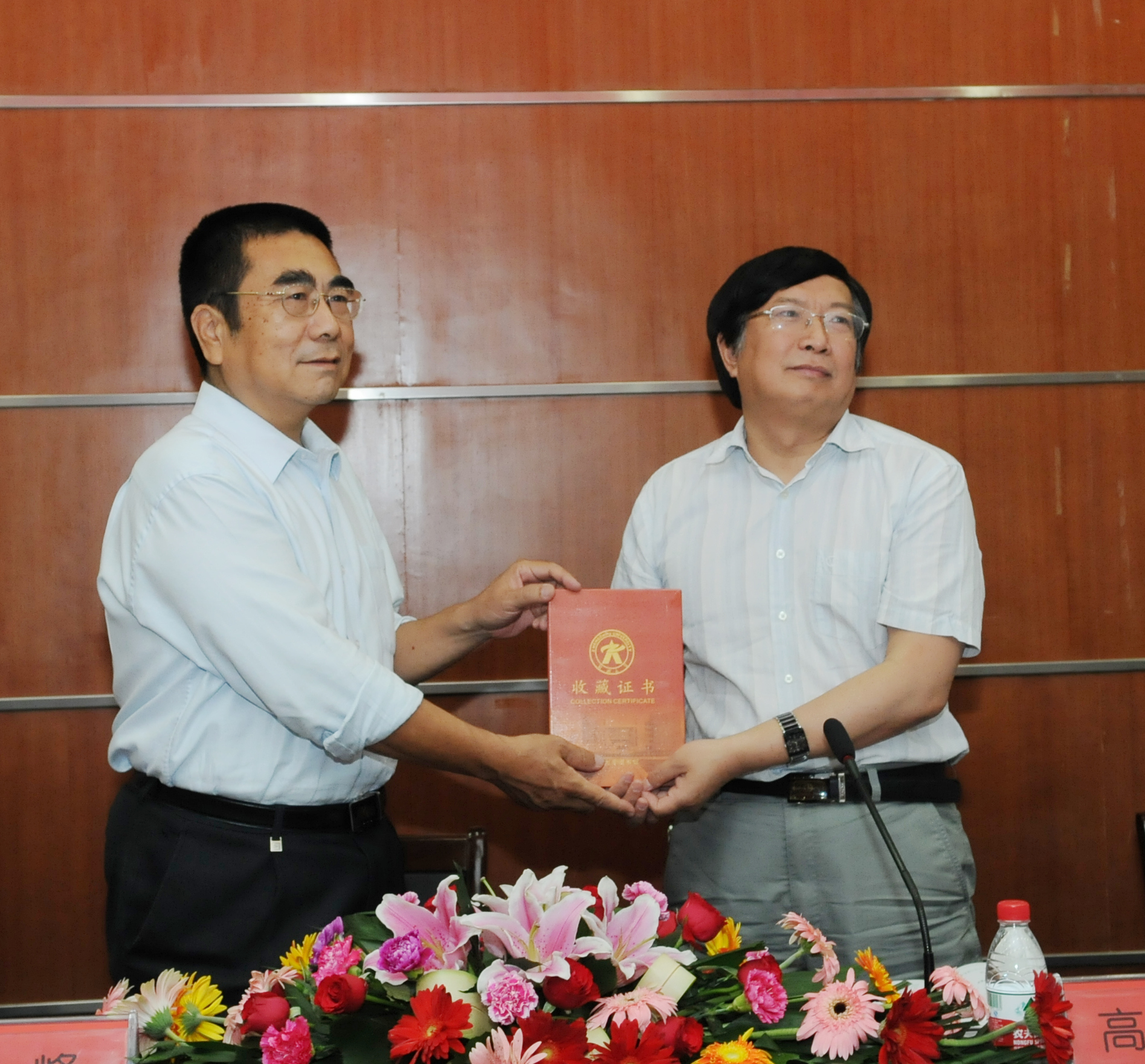 高治军先生将他已出版的7本诗集,每种各20本捐赠给了德赢图书馆,并将《诗颂中原》一书赠给参会同学。党委常务副书记陈一峰为高治军先生颁发了捐赠证书。