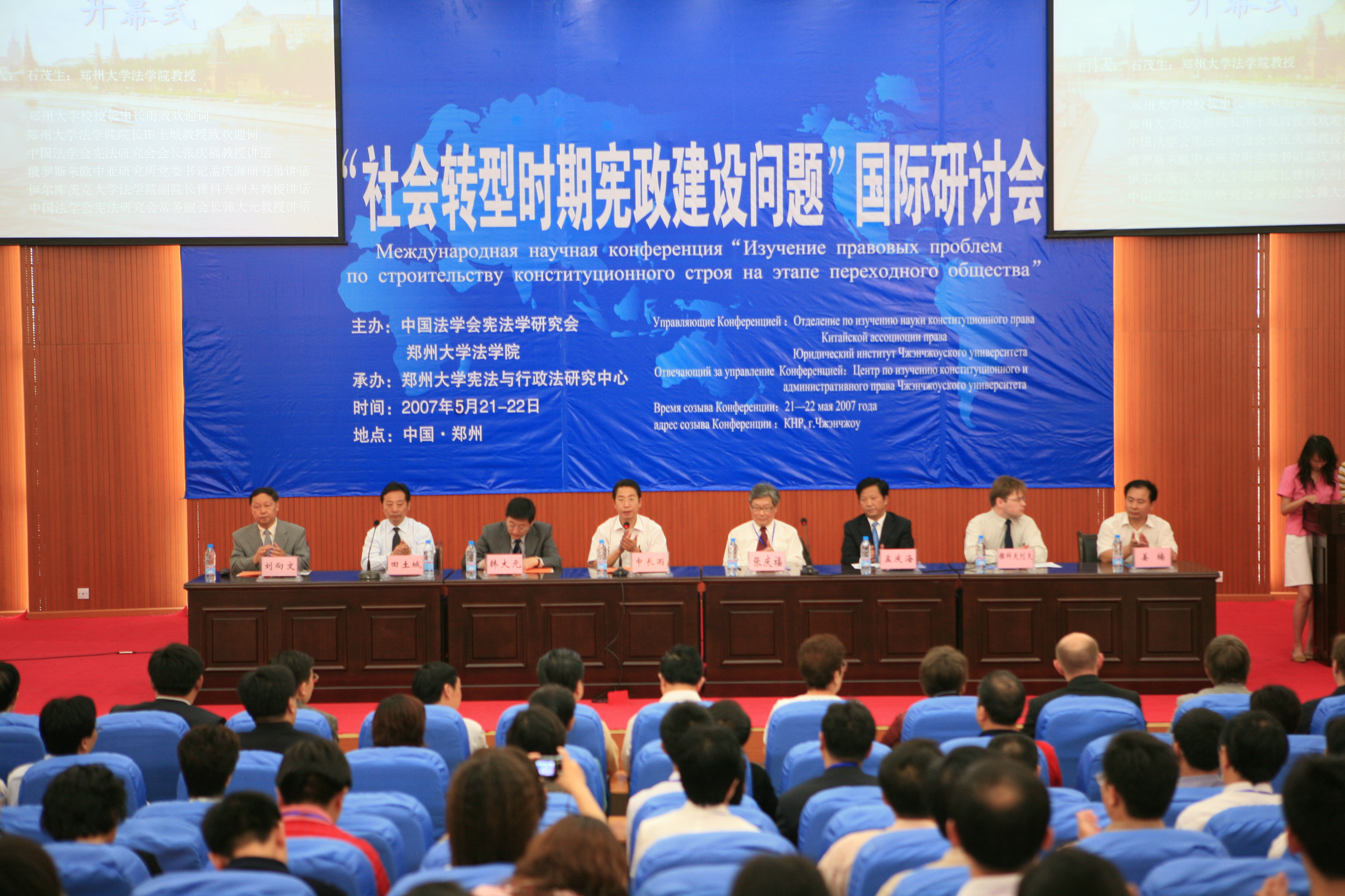5月21日上午,社会转型时期宪政建设问题国际研讨会开幕式在德赢法学院模拟法庭隆重举行。中国法学会宪法学研究会会长张庆福教授,中国社科院俄罗斯中亚研究所党委书记兼副所长孟庆海教授,伊尔库茨克国立大学法学院副院长雅科夫列夫•弗拉季斯拉夫•维克托罗维奇教授,中国法学会宪法学研究会常务副会长、中国人民大学法学院常务副院长韩大元教授,省教育厅社政处姜楠副处长,德赢校长申长雨教授等在主席台就座。来自中国、俄罗斯的百余名专家、学者、司法界人士以及法学院师生共300余人参加了开幕式。
