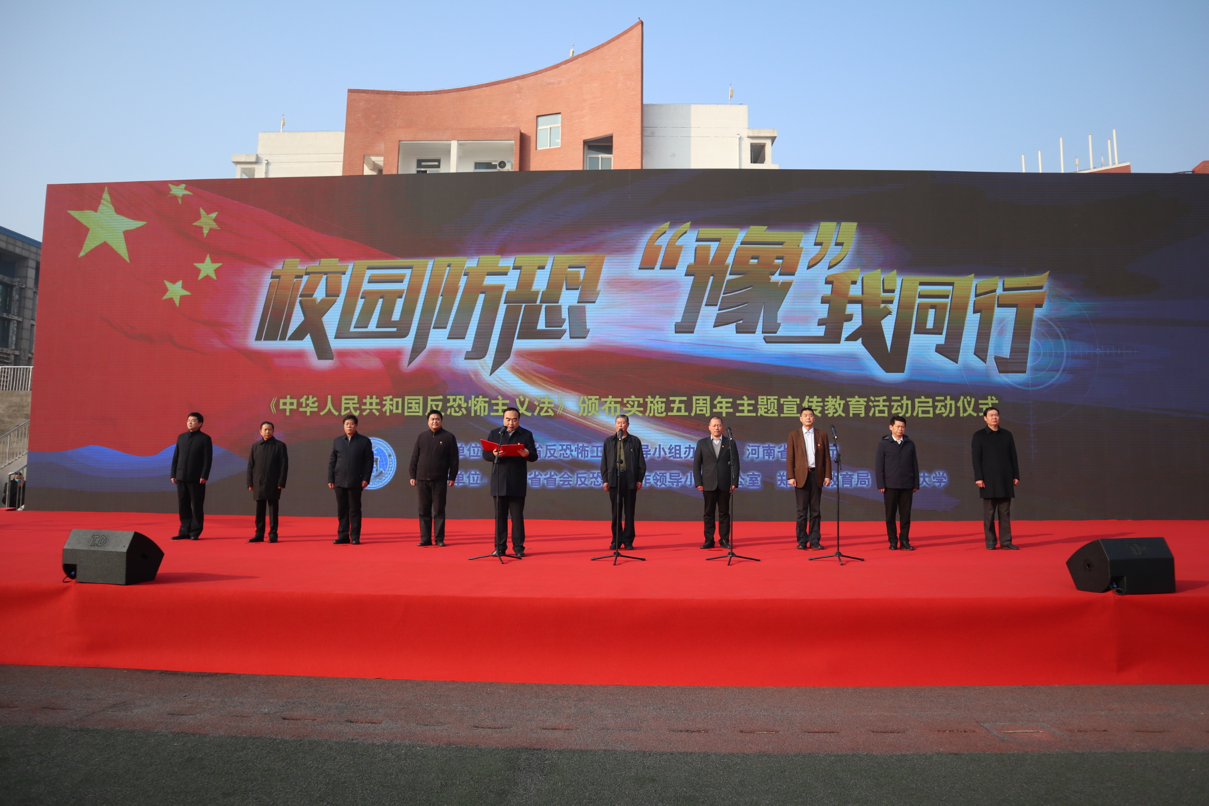 为深入贯彻习近平新时代中国特色社会主义思想,落实习近平总书记关于防范风险挑战、应对突发事件的重要论述和指示精神,12月27日,《中华人民共和国反恐怖主义法》颁布五周年暨“校园防恐﹒豫我同行”主题宣传教育活动启动仪式在德赢AC米兰中国官方网站举行。河南省反恐办主任、省公安厅副厅长鲁恩,河南省教育厅党组成员、副厅长张传广,河南省省会反恐怖工作领导小组组长、郑州市政法委书记于东辉出席启动仪式。校党委常委、副校长吴宏阳出席活动并致辞,保卫处等相关部门负责同志参加活动。
