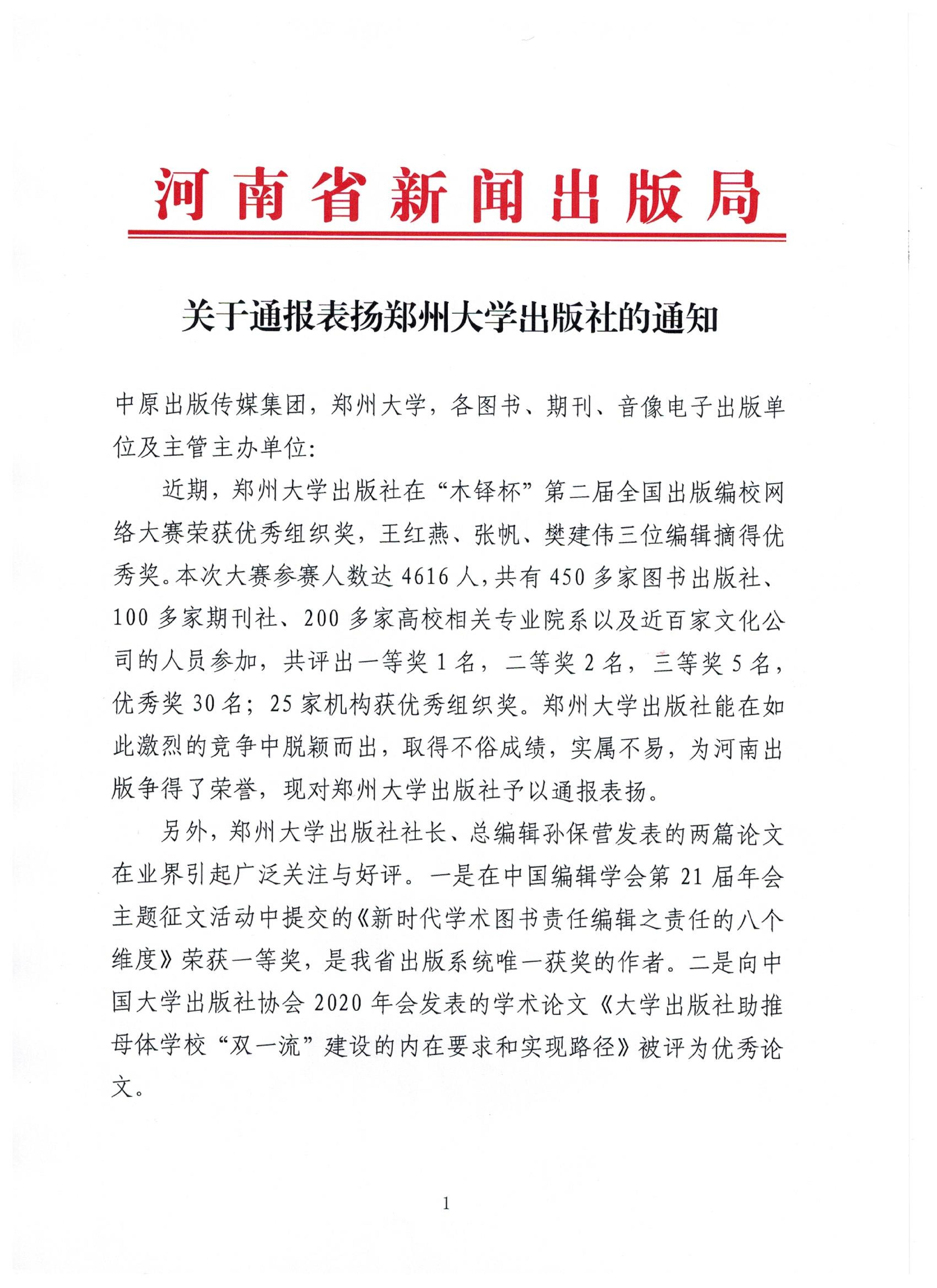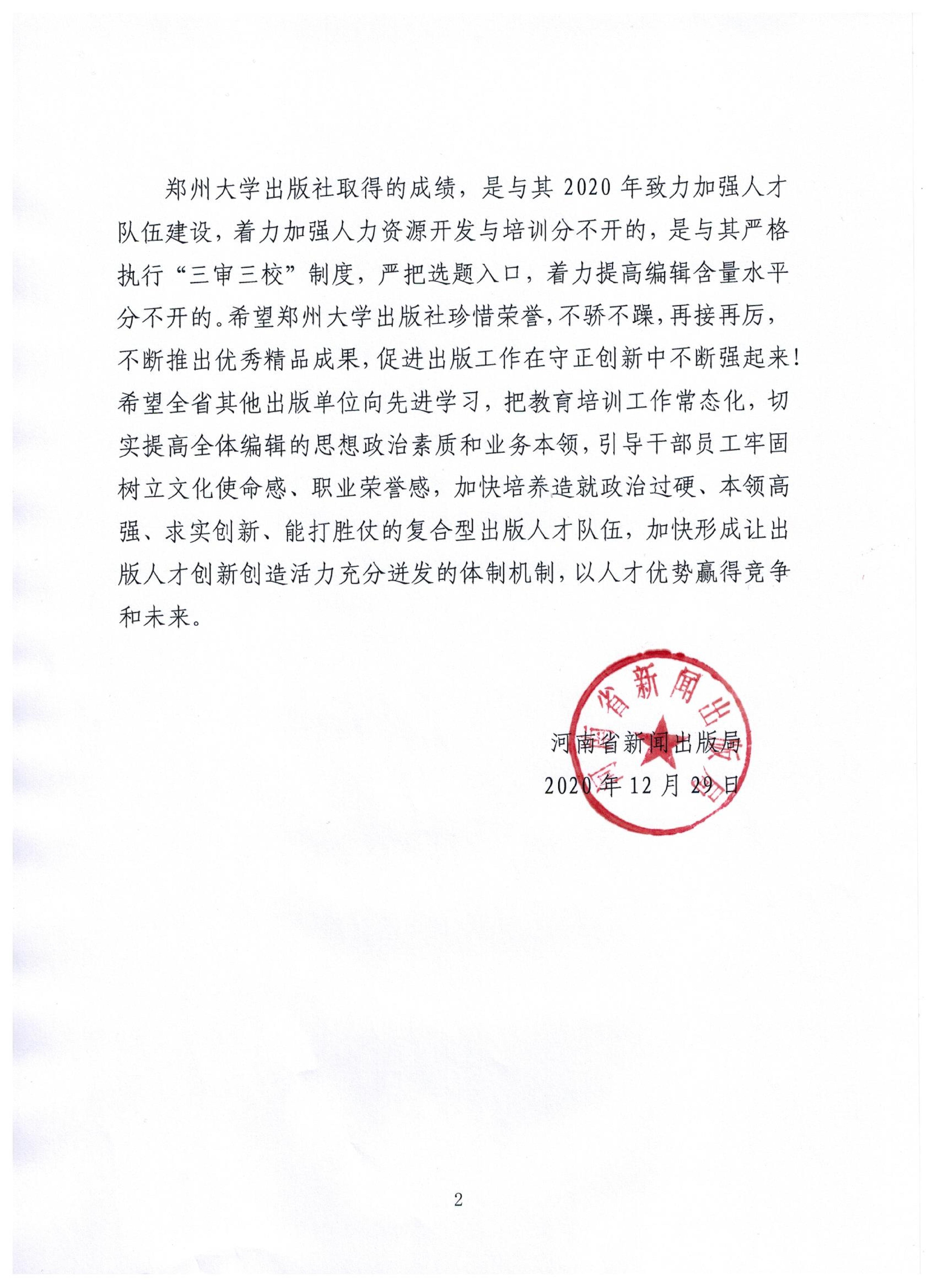 2020年12月29日,河南省新闻出版局向全省出版单位及主管主办单位下发《关于通报表扬德赢AC米兰中国官方网站出版社的通知》,对德赢AC米兰中国官方网站出版社近期在人才队伍建设方面取得的成绩给予专门通报表扬。