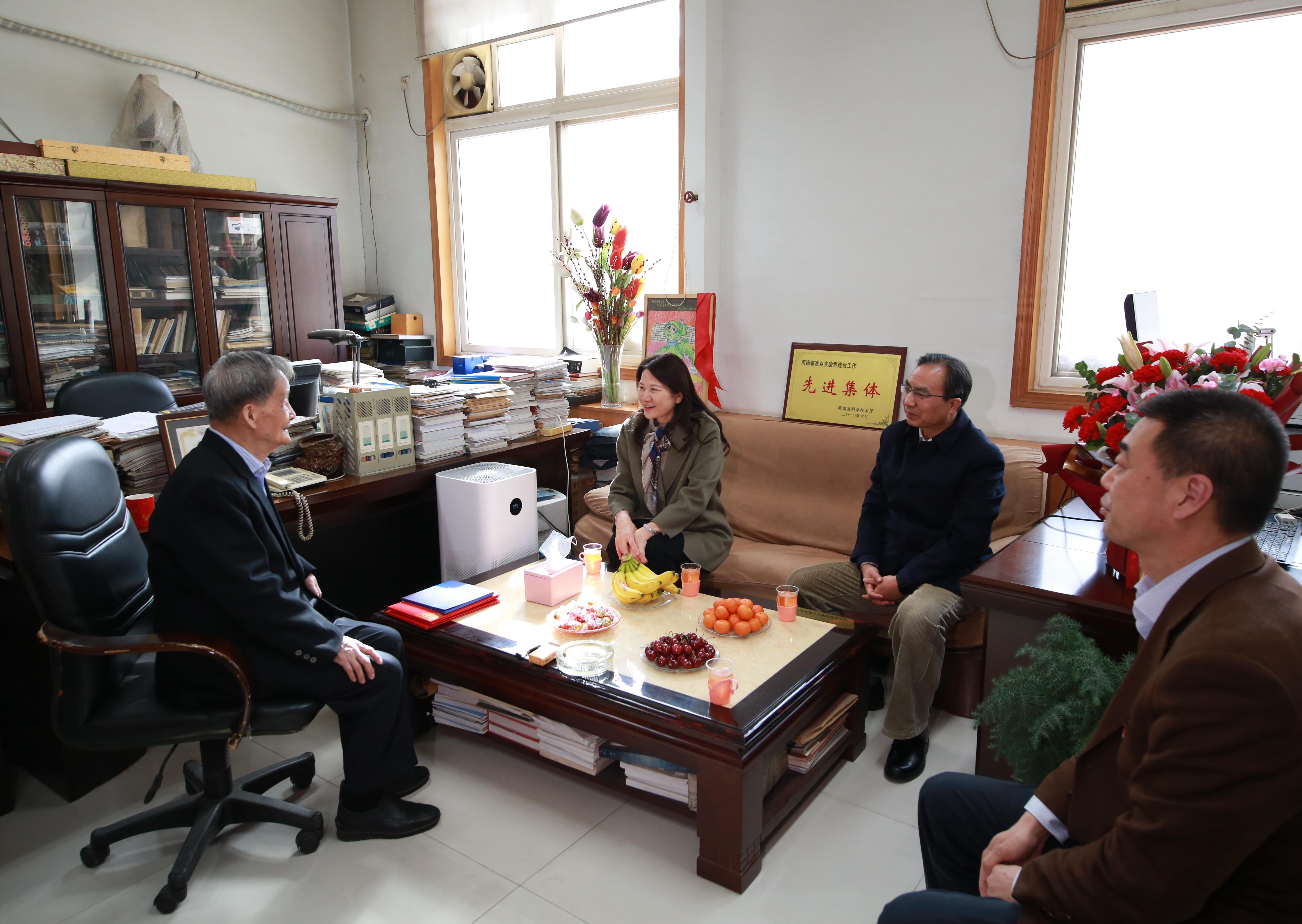 2月5日上午,副省长霍金花、省政府副秘书长尹洪斌、省科技厅副厅长刘保民一行来校看望慰问中国科学院院士吴养洁,校党委副书记吴宏阳,中国工程科技发展战略河南研究院办公室、中国科学院河南院士联络处、南校区综合管理中心、化学学院等单位负责同志参加慰问。