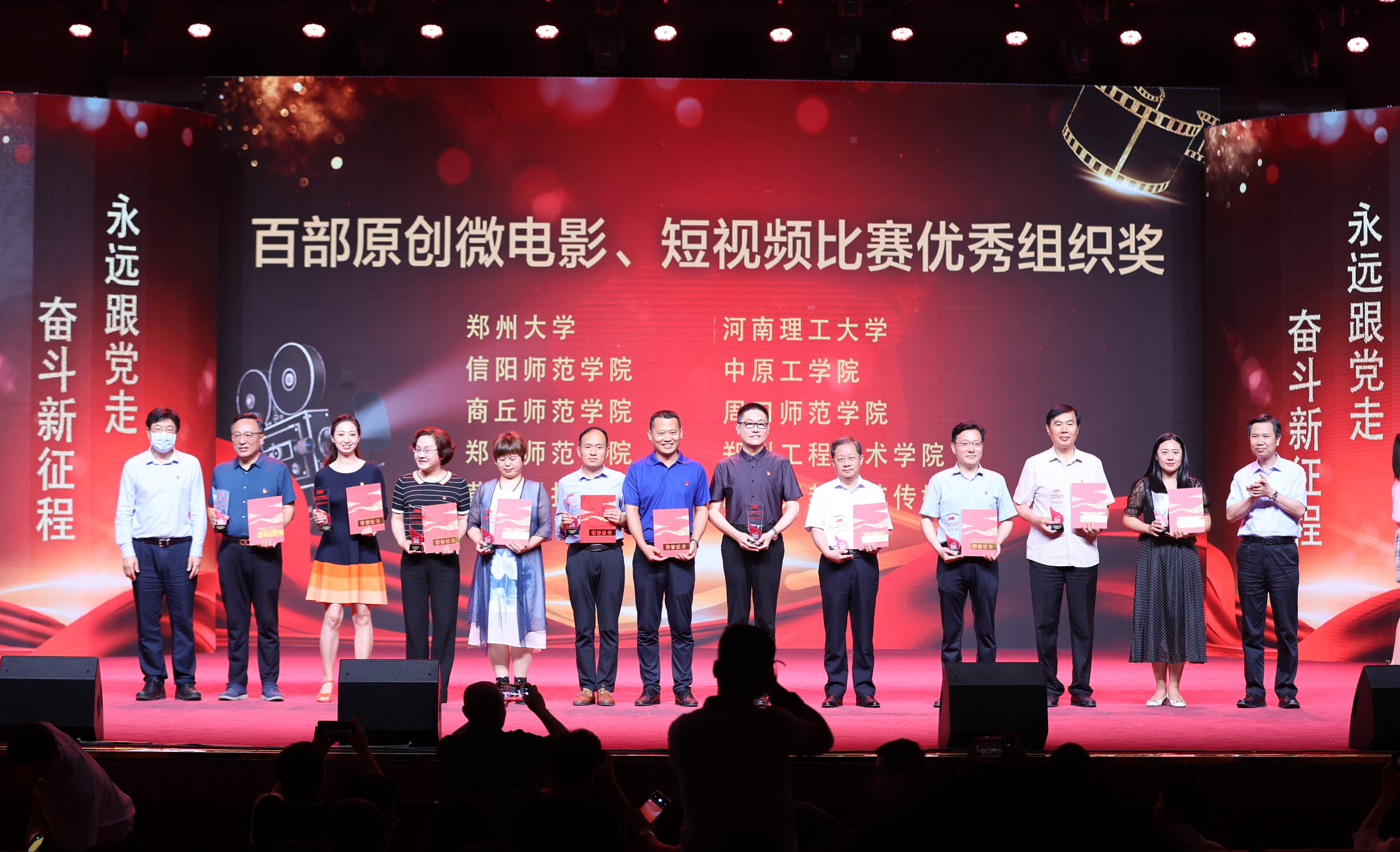 此次活动中精选“100部电影讲课堂”“红动中原跨越时空的思政课”系列活动中的优秀获奖作品,经过精心包装设计集中展演。“100部电影进课堂”活动自4月1日启动以来,征集并公布了100部经典电影目录,在此基础上,78所高校报送了1022部红色经典电影剪辑作品,60余所高校报送了462部原创短视频及微电影作品。其中新闻与传播学院报送的红色经典电影剪辑作品《永不消逝的电波》、原创短视频《秀美郝堂—茶香里的婉约》分别荣获该类别一等奖。此外,在“红动中原跨越时空的思政课”河南省高校学生参演革命电影微视频展播活动中,马克思主义学院选送的《血战湘江》荣获该类别最佳思政点评奖。德赢AC米兰中国官方网站还荣获“百部经典红色电影剪辑比赛”和“百部原创微电影、短视频比赛”优秀组织单位,新闻与传播学院宗俊伟老师荣获优秀指导教师奖。与会领导分别为获奖单位代表颁奖。