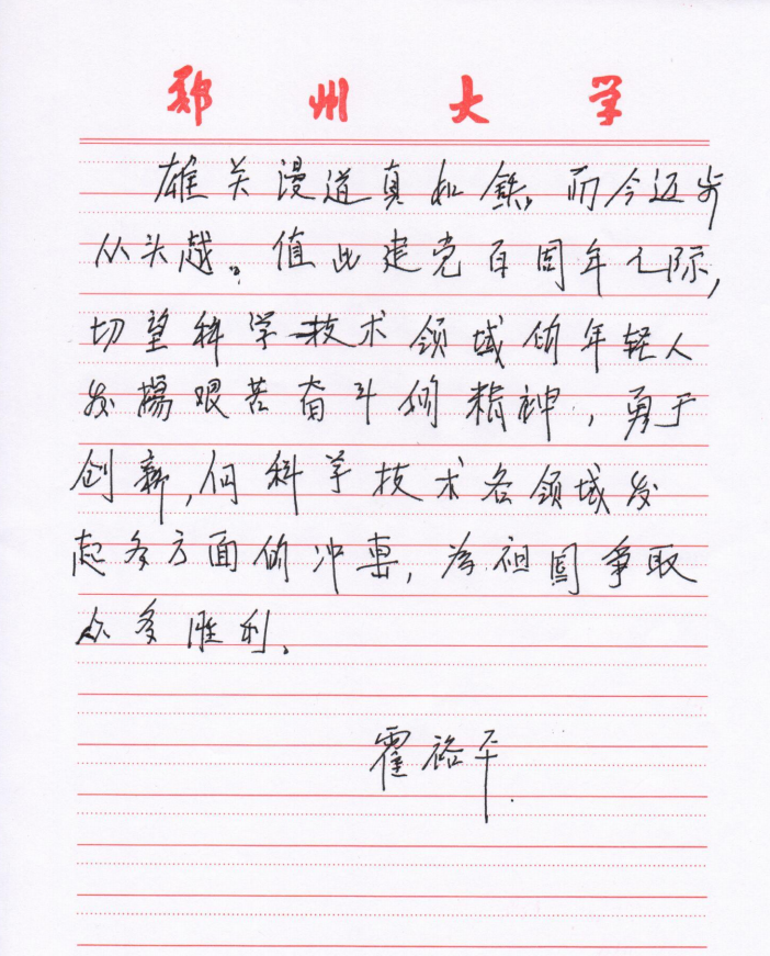 中国科学院院士霍裕平表示,雄关漫道真如铁,而今迈步从头越。值此建党百周年之际,切望科学技术领域的年轻人发扬艰苦奋斗的精神,勇于创新,向科学技术各领域发起多方面的冲击,为祖国争取众多胜利。
