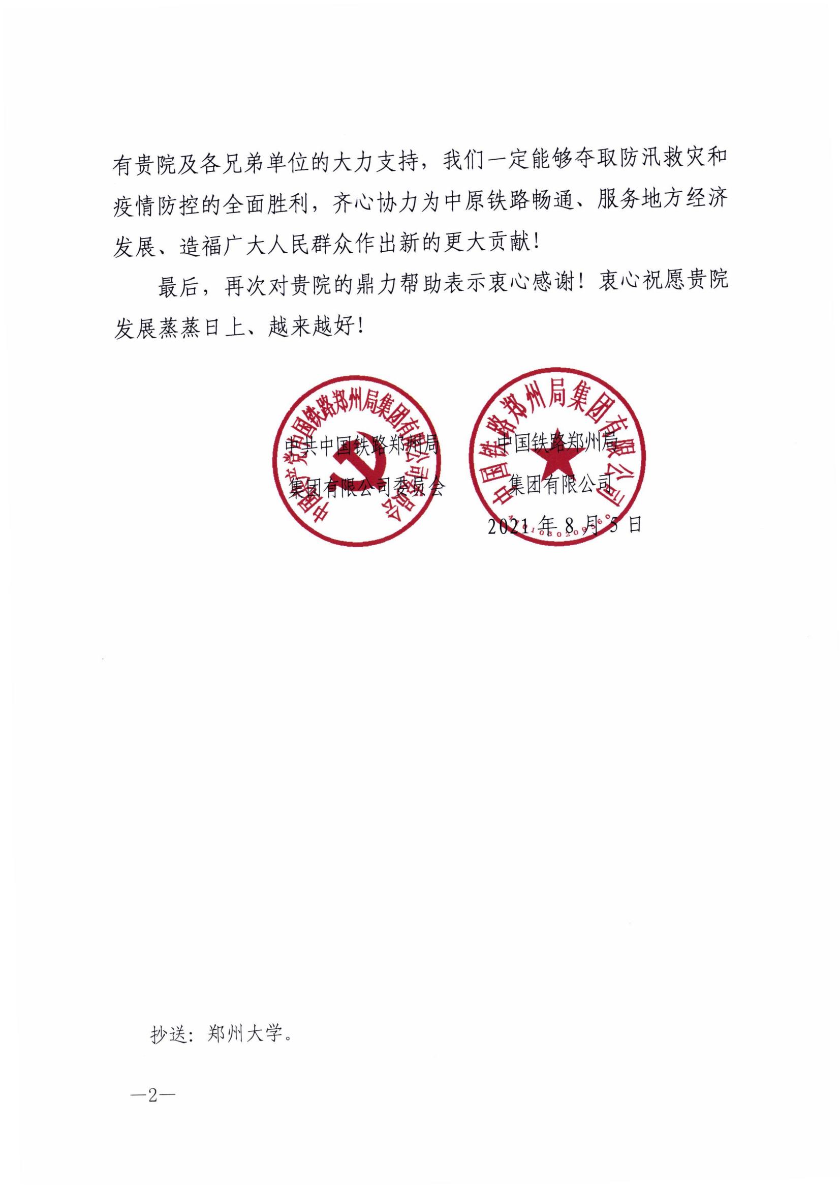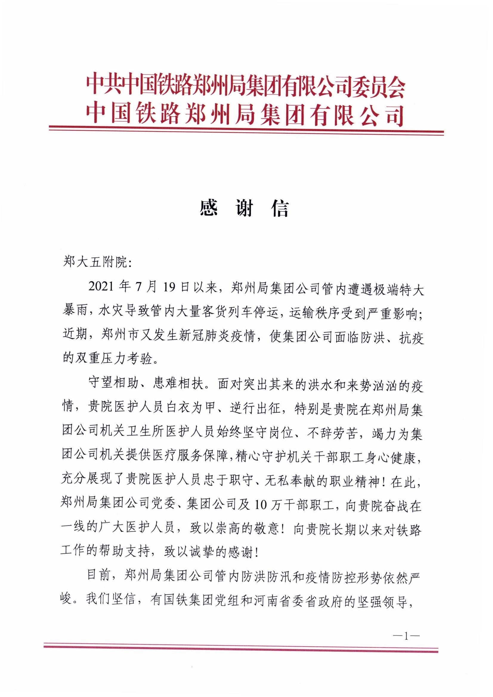 8月5日,中国铁路郑州局集团有限公司向德赢AC米兰中国官方网站五附院发来感谢信,对近期连续发生的极端特大暴雨和新冠肺炎疫情以来,医院直属郑州局集团公司机关卫生所医护人员坚守岗位、不辞辛苦,为该公司机关提供医疗服务保障,守护干部职工身体健康的事迹给予高度评价。