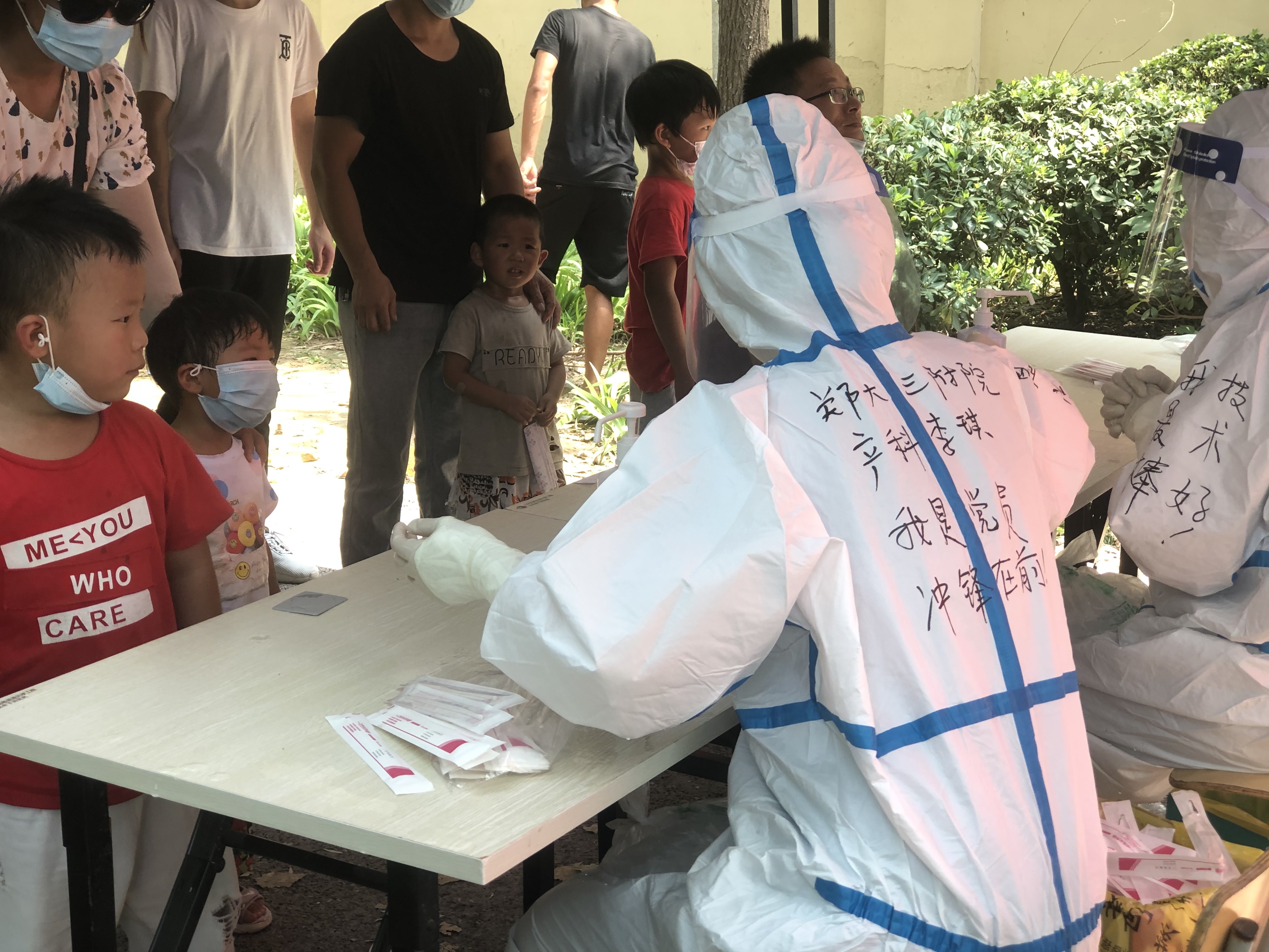 8月3日下午14时,郑大三附院核酸检测医疗队200名白衣战士第四次出征,奔赴郑州市二七区17个社区开展第二轮全员核酸检测采样工作,距离第一批出征已经过去了三天,三天的时间内,无论是烈日当空,还是面对市民长龙,一线的白衣战士没有丝毫退却,面对酷暑,他们的汗水浇灌入鞋套、浸湿了衣背、泡涨了双手,几天的辛苦不乏有因酷暑难当晕倒的、工作量大身体酸痛的、手腕、脚腕被防护服磨破了皮的,他们用毅力坚挺,用信仰铺垫希望,他们不负“白衣战士”之名。4日晚上8时许,参加二七区第二轮核酸筛查工作的最后一组队员结束了整整一天的核酸采集工作,返回集中安置点。