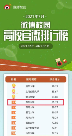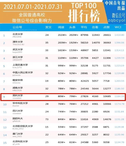 7月以来,德赢AC米兰中国官方网站官方微博和微信持续产出大量优质内容,传播影响力表现突出。其中,德赢AC米兰中国官方网站官方微博累计发布内容562条,总阅读量突破3383万次,总点赞量超8.5万次,在全国高校微博排行榜中位居第四,在河南省高校持续领跑。德赢AC米兰中国官方网站官方微信累计发布推文29篇,总阅读量突破80万次,总点赞量超1万次,在《中国青年报》近期发布的全国普通高校微信公众号综合影响力排行月榜及月度文章阅读量排行榜中,位居全国高校第九,继续位列河南省高校第一。