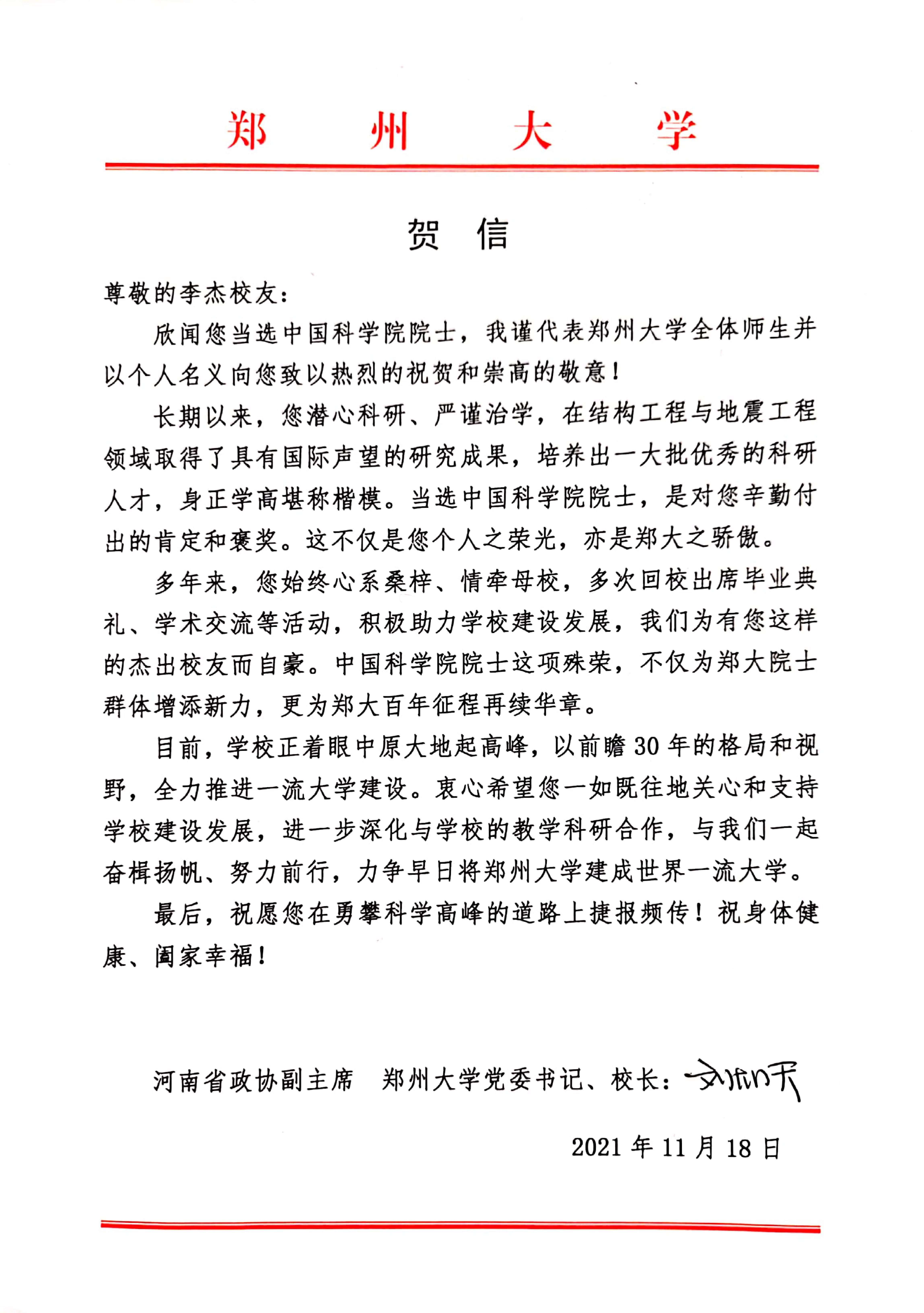 信中对李杰校友当选中科院院士表示热烈祝贺和崇高敬意,并充分肯定了李杰校友在其研究领域的突出贡献和对母校建设发展的殷切关怀。信中指出,李杰校友当选中国科学院院士,不仅是个人之荣光,亦是郑大之骄傲,不仅为郑大院士群体增添新力,更为郑大百年征程再续华章,希望李杰校友一如既往关心支持学校建设发展,进一步深化与学校的教学科研合作,与学校一道奋楫扬帆、共建一流。