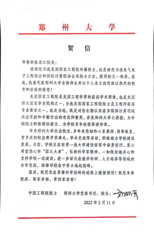 信中对张宏江校友当选美国国家工程院外籍院士表示热烈祝贺和崇高敬意,并充分肯定了张宏江校友长期以来对母校建设发展的殷切关怀。信中指出,张宏江校友当选美国国家工程院外籍院士,既是对其在多媒体计算领域杰出贡献和辛勤付出的肯定和褒奖,亦是德赢AC米兰中国官方网站之骄傲,为学校院士群体增添新力,为学校百年征程再谱华章,希望张宏江校友心怀“国之大者”,弘扬科学家精神,一如既往关心支持学校一流建设,进一步深化在教学科研、人才培养等领域的合作交流,助推母校在中原大地起高峰。