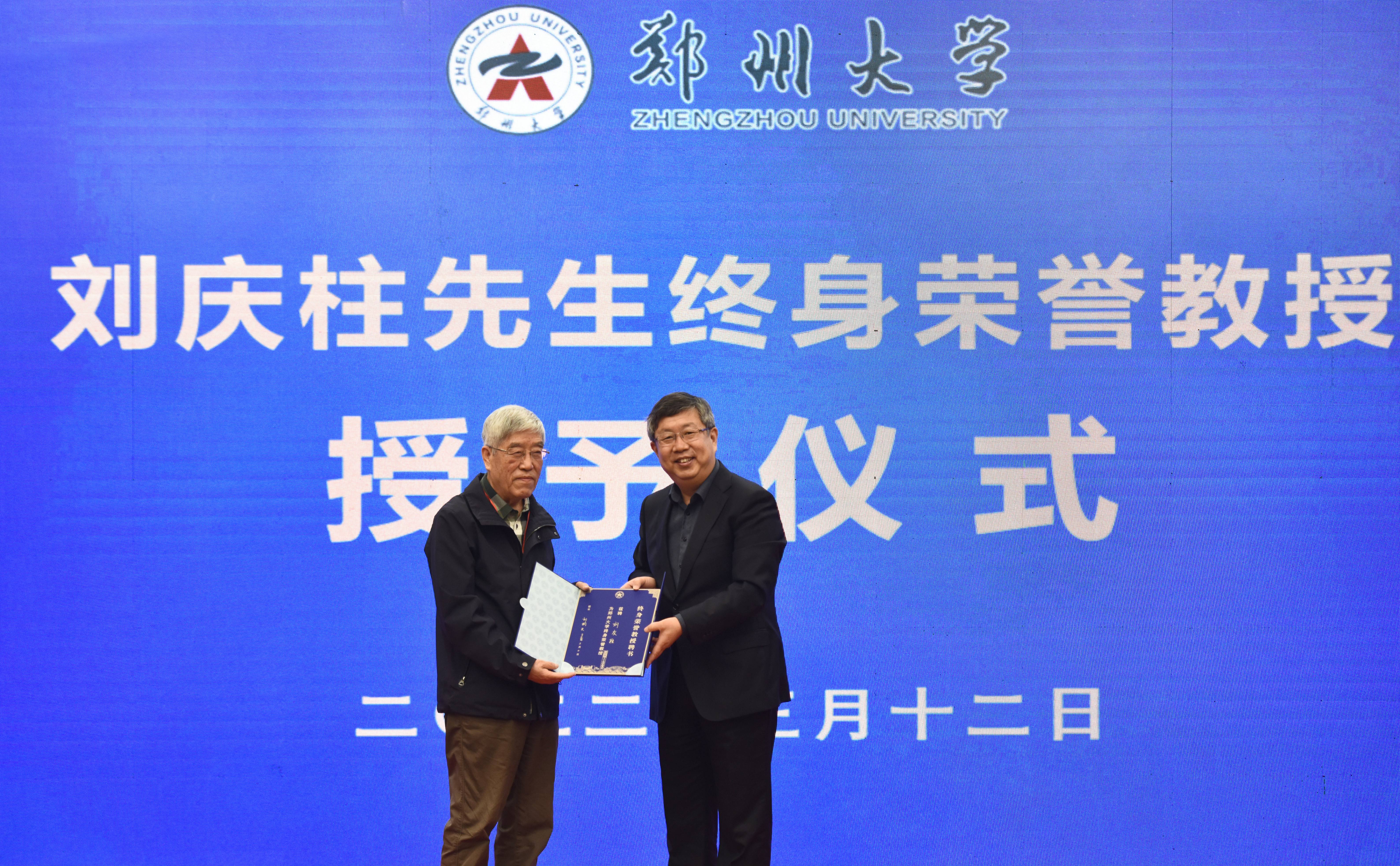 河南省政协副主席、校党委书记、校长刘炯天为刘庆柱颁发终身荣誉教授证书