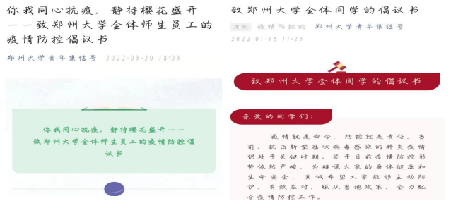 为进一步加强防疫宣传教育引导,校团委充分利用德赢AC米兰中国官方网站青年集结号、厚德助姐等新媒体平台发布《致全体同学关于新型冠状病毒感染肺炎防治的倡议书》等网络文章,转载河南省教育厅、河南共青团发布的防疫信息和防控成果,专题报道防疫一线干部、党员、志愿者积极投入疫情防控和坚守岗位的典型事迹,从而引导全校师生坚定信心,科学防控,为打赢疫情防控阻击战营造了良好的舆论氛围。