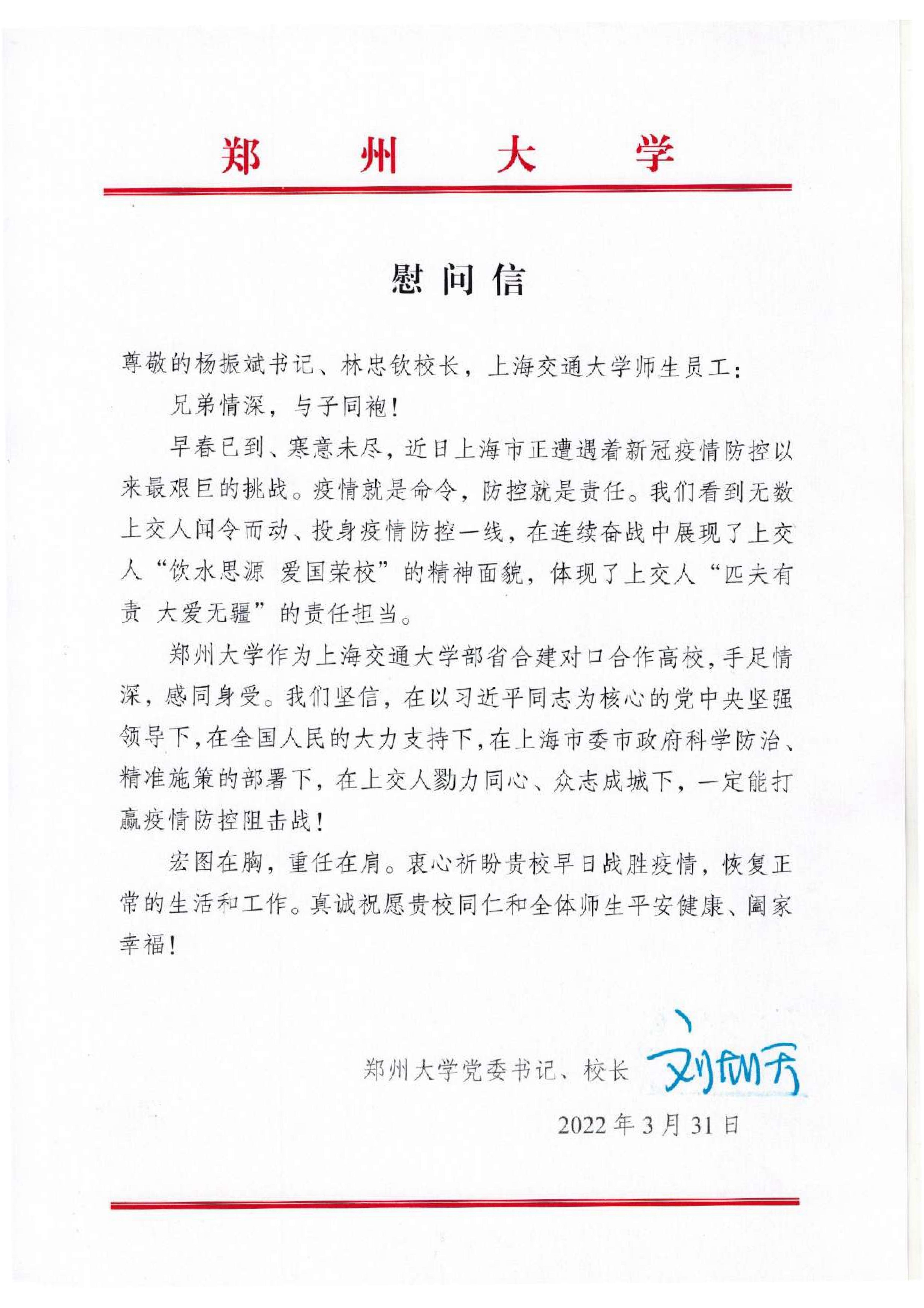 近期,上海市正处于疫情高位流行状态。上海交通大学和德赢AC米兰中国官方网站是部省合建对口合建合作高校,3月31日,省政协副主席、校党委书记、校长刘炯天代表学校,向上海交通大学全体师生员工发去慰问信,衷心祝愿上海交通大学早日战胜疫情,恢复正常生活和工作,真诚祝愿上海交通大学全体师生平安健康、阖家幸福。