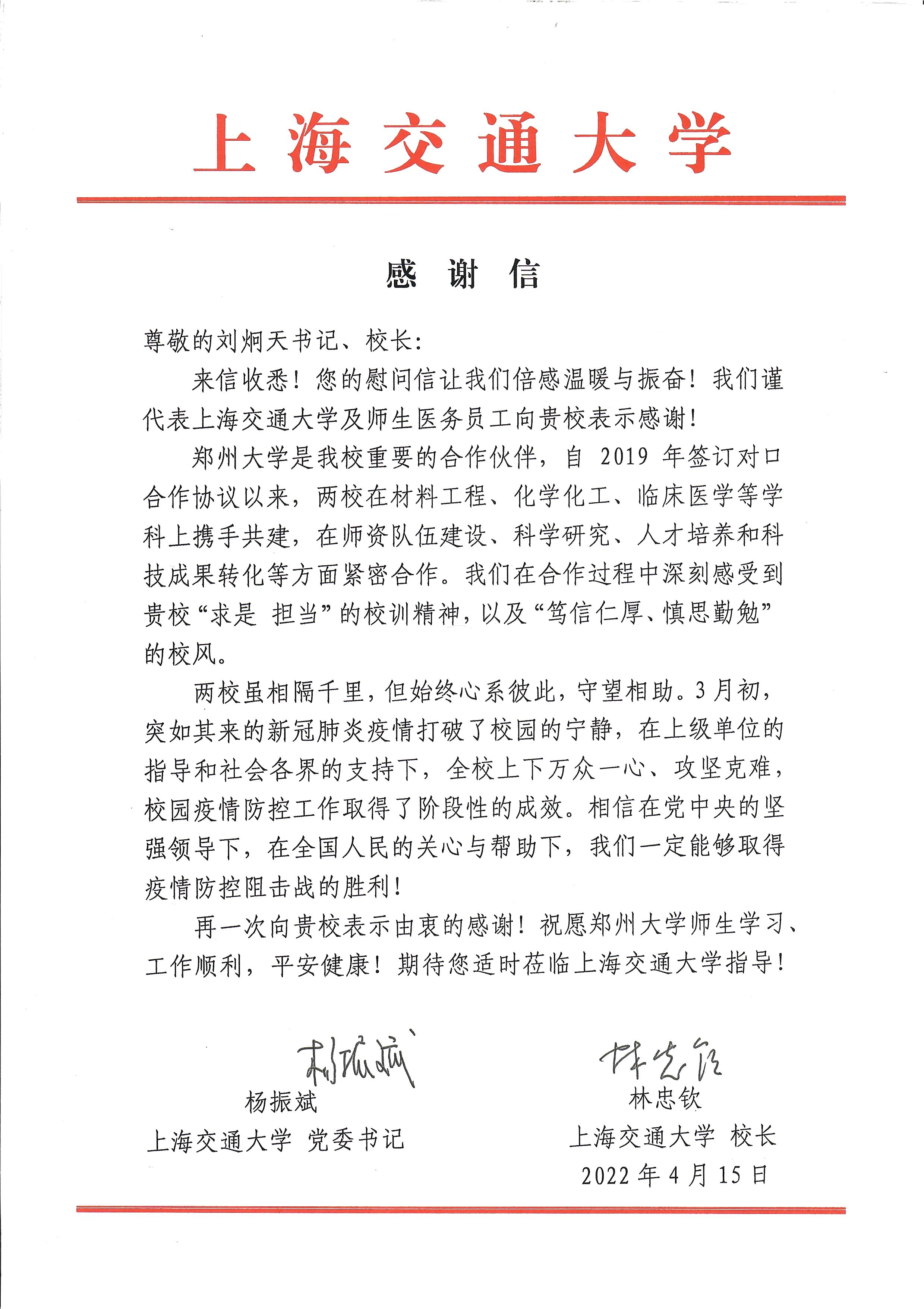 4月15日,上海交通大学向德赢AC米兰中国官方网站发来感谢信。信中表示,在上海交通大学全体师生抗击疫情的关键时期,德赢AC米兰中国官方网站发来的慰问信让大家倍感温暖与振奋。信中指出,在两校的交流合作过程中,上海交通大学深刻感受到了德赢AC米兰中国官方网站“求是担当”的使命与精神,以及“笃信仁厚、慎思勤勉”的校风。两校虽相隔千里,但始终心系彼此,守望相助。突如其来的新冠肺炎疫情打破了校园的宁静,在上级单位的指导和社会各界的支持下,上海交通大学全校上下万众一心、攻坚克难,校园疫情防控工作取得了阶段性的成效。相信在党中央的坚强领导下,在全国人民的关心与帮助下,一定能够取得疫情防控阻击战的胜利!信中还祝愿德赢AC米兰中国官方网站师生学习、工作顺利,平安健康。