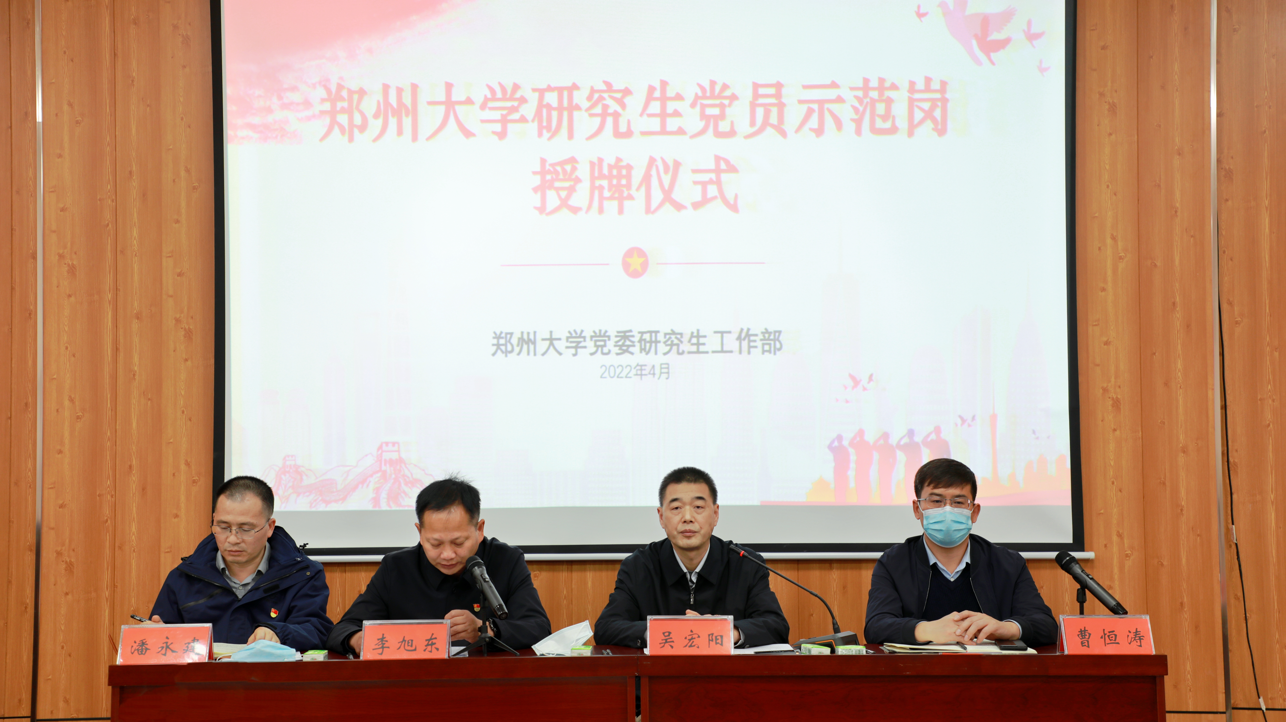 吴宏阳在讲话中指出,习近平总书记在中国人民大学调研时勉励全国广大青年牢记党的教诲,立志民族复兴,不负韶华,不负时代,不负人民,在青春的赛道上奋力奔跑,争取跑出当代青年的最好成绩。在五一劳动节和五四青年节即将到来之际,对典型示范作用突出、学习工作业绩出色的研究生党员示范岗进行授牌表彰,具有重要意义。就如何扎实有效开展研究生党建工作、充分发挥示范带动效应,提出三点要求。一是不忘初心,坚持党的领导,发挥党员先锋模范作用。一直以来,以习近平同志为核心的党中央高度重视高校党建工作。《中国共产党普通高等学校基层组织工作条例》《关于新时代加强和改进思想政治工作的意见》《教育部等八部门关于加快构建高校思想政治工作体系的意见》等一系列重磅文件的修订或出台,为研究生党建工作创新提供了行动纲领和指南。要始终牢记立德树人根本任务,重点解决好“培养什么人”、“怎样培养人”、“为谁培养人”这一根本性问题。通过党员先锋模范作用的发挥,教育引导广大青年深刻认识红色政权来之不易、新中国来之不易、中国特色社会主义来之不易,胸怀“国之大者”,勇担时代使命。二是精耕细作,将“试验田”变“示范田”,发挥示范带动效应。要将强化理论武装作为终身必修课,在常学常新、常悟常新、常用常新中增强“政治三力”,并将学习成效不断转化为干事创业的强大动力。同时要从小事着手,强化示范带动,引领塑造优良学风、健康人格和高尚情操。发挥好桥梁纽带作用,真心实意为同学办实事、做好事、解难事,增强组织工作的凝聚力、号召力、引领力。三是保持定力,扛稳党建工作责任,同心协力战胜疫情。坚持“外防输入,内防反弹、动态清零”不动摇,坚持疫情防控不放松,充分认识校园疫情防控工作的极端重要性,让党旗在校园抗疫一线高高飘扬。吴宏阳强调,要紧紧围绕迎接、宣传、贯彻党的二十大主题主线,全面激发组织活力,形成共识凝聚合力,激励广大研究生立志报国成才,以实际行动助力世界一流大学建设,助推中原大地起高峰,以优异成绩喜迎党的二十大胜利召开。