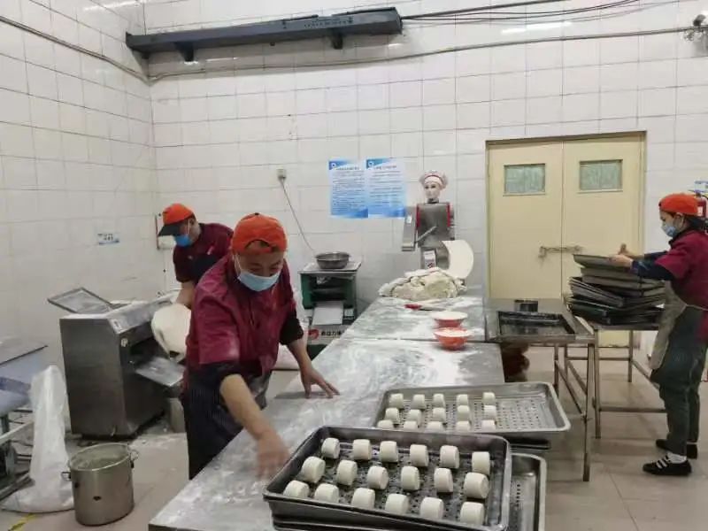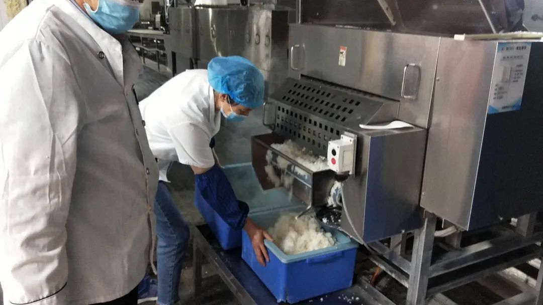 受限于打包取餐的形式,馒头量和米饭量的准备工作激增。凌晨2点已经在开始着手蒸馒头了。人工和面不停歇,和面机连续运行一夜,一台蒸箱40分钟仅能出锅500个馒头,食堂人员分工配合,彻夜连轴转。早上7点,40000个馒头已经准备完毕。同样在夜晚奋战的还有米饭生产线的人员,组长陈帅家凌晨4:00便和5名在校员工加足马力蒸制米饭,机器不停人不停,一直到当天下午18:00,14个小时生产了600锅共计18000斤大米,是平日米饭供应量的整整一倍。米饭蒸好还需要配送至各个食堂,面对巨大的供应量,平时足够正常使用的200多个保温箱也需要回收清洗消毒后循环利用。“蒸米—配送—回收—清洗—再装箱”,14个小时内米饭生产线人员不知道重复这一流程多少次。