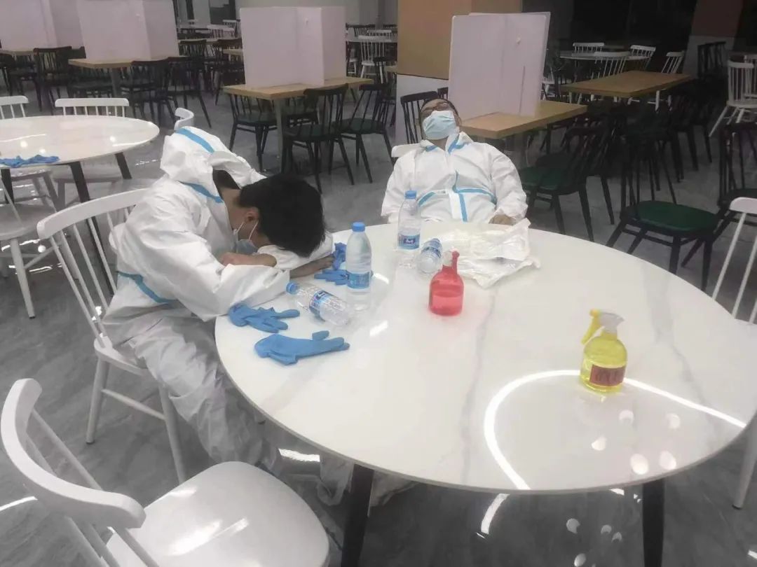 由于接到静态管理通知的时间已经是晚上7点,采购部即便连夜到批发市场采购蔬菜也可能无法满足第二天的早餐,于是饮食服务公司只得调整早餐品种,利用库存的原材料进行备餐,“品种不多,但要保证学生吃上饭”。5月6日早上,彻夜奋战的饮食人,又一次投入到早餐供应工作,早上6点半准时将足量的热菜热饭备齐,7点已经陆续有学生打包取餐。这是封闭管理的第一顿餐,但饮食人不敢松劲。上午10:30,各食堂陆续开始午餐供应,逐渐升至31度的户外气温、密不透风的防护服、热腾腾的饭菜,售餐员的衣服很快被浸湿。随着核酸检测的陆续完成,食堂门口已经排起了长龙,而食堂售饭台移至餐厅门口后数量有限,饭菜从后厨加工制作、打包装盒到运送至餐厅楼外售饭台的过程较平时花费的时间三倍有余,供应处于紧张状态。看着长长的队伍和焦急的同学们,所有饮食人心急如焚、彻夜未眠的准备工作在集中涌来的人流量前显得十分苍白,“快一点、再快一点”,尽全力加速再加速盛饭、打包、搬运。早上9点半、下午13点、晚上7点,当看到最后一名学生拿上套餐离开时,饮食人才能有一丝丝的欣慰与满足。
