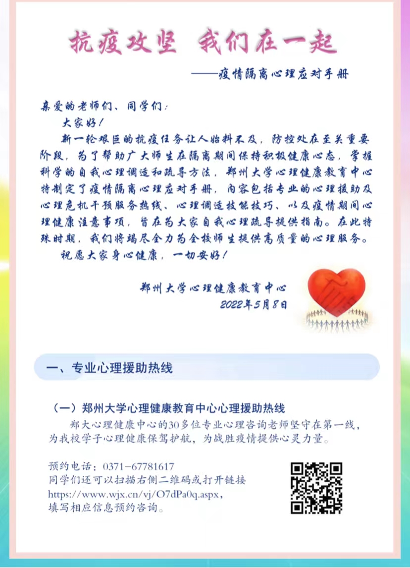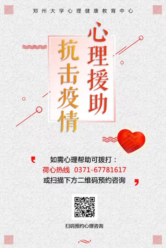心理健康教育中心多维度汇聚心理健康服务资源,为学生提供多渠道多层次的帮扶。全面发布教育部华东师范大学心理援助热线、全国各地市心理援助热线、河南省心理援助热线、中国心理危机与自杀干预中心救助热线,链接全社会心理健康服务多方优质力量,帮助学生获取足够的心理服务资源,共度疫情焦灼时期。