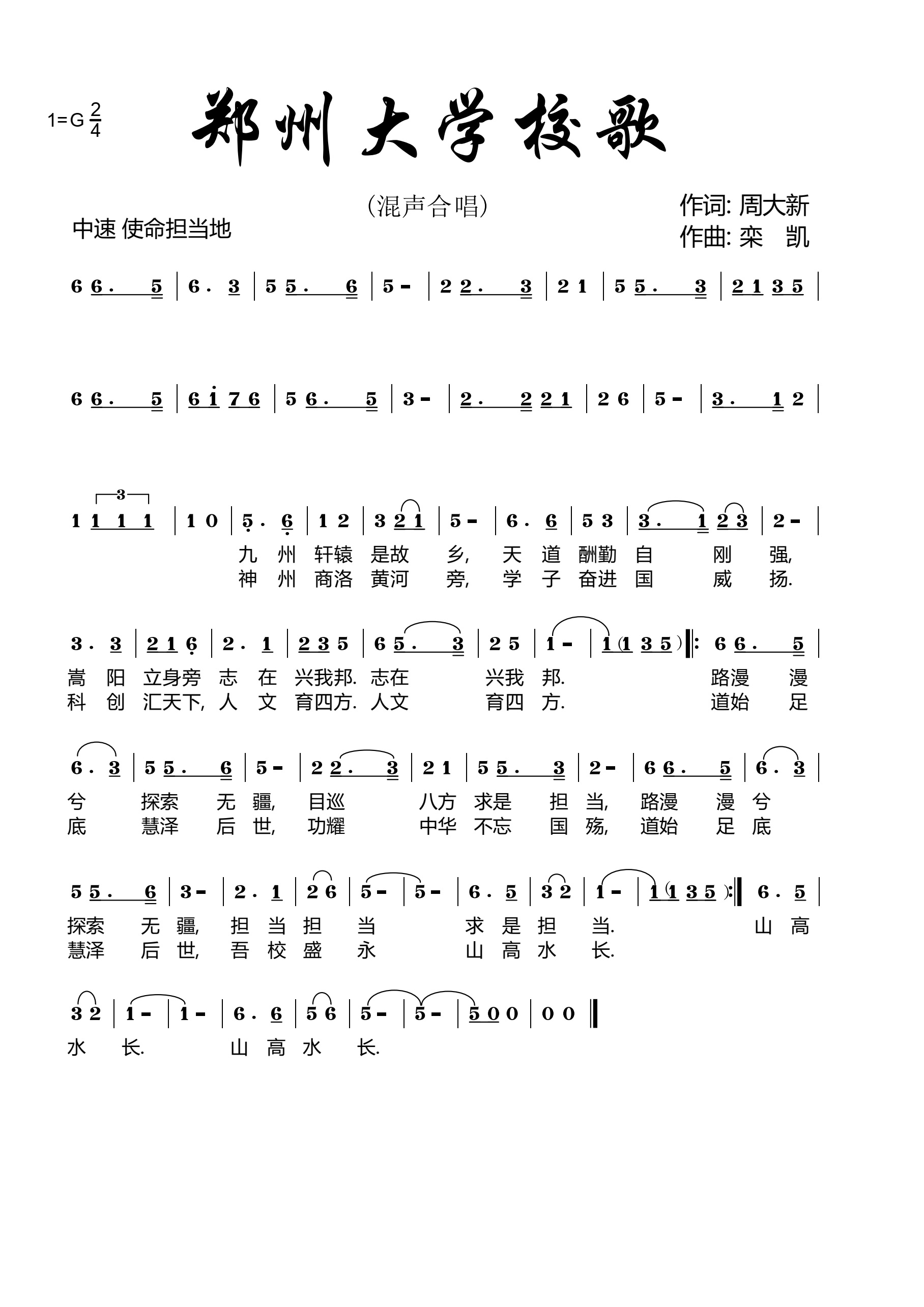 吾校盛永,山高水长。最后一句表达了全体郑大人对学校的热情赞美和美好祝愿,希望学校在世界一流大学建设过程中踔厉奋发,勇毅前行,薪火相传,永续辉煌,奋力谱写高质量发展的崭新篇章。