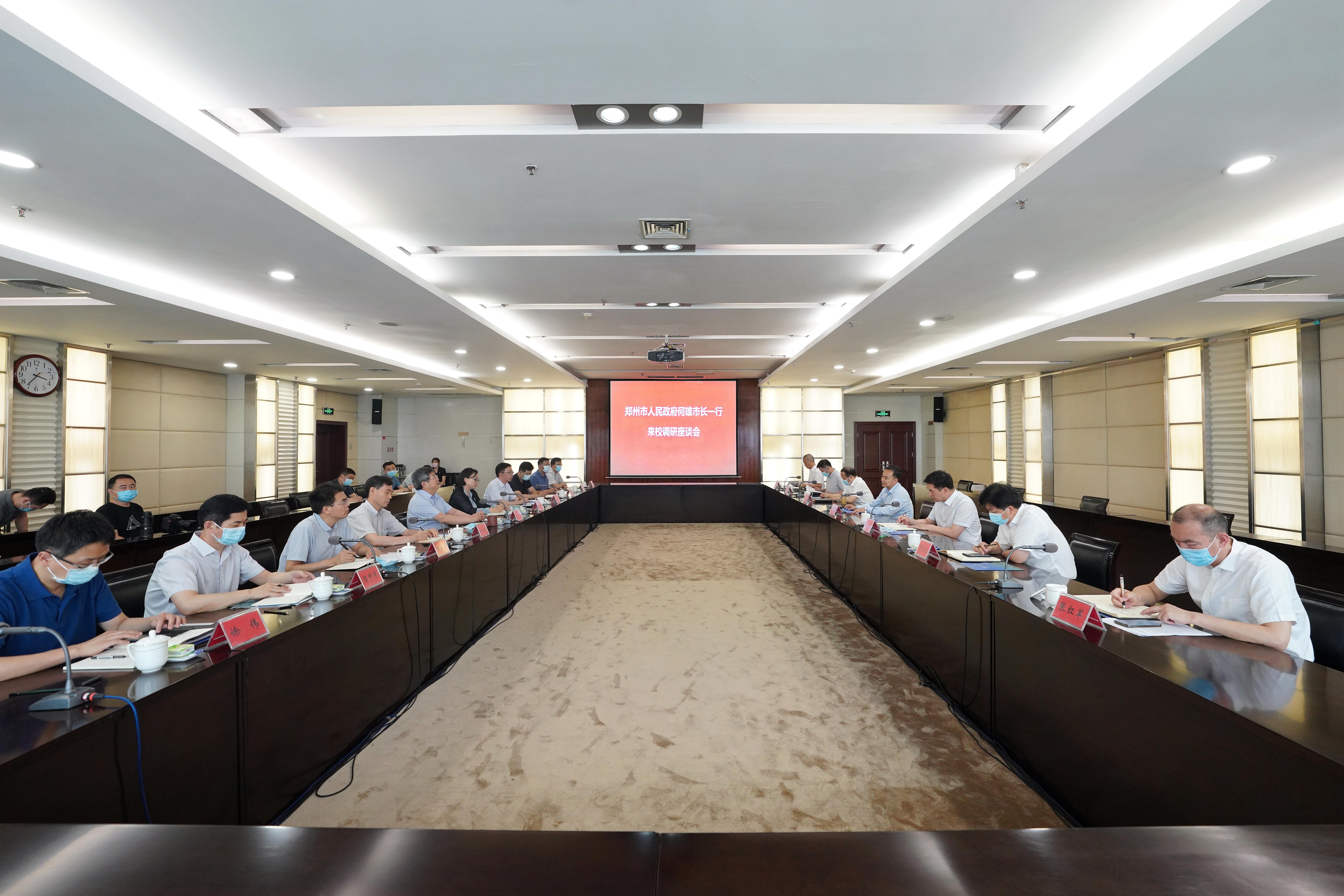 6月17日,郑州市委副书记、市长何雄到德赢AC米兰中国官方网站调研座谈,深入推进名城名校融合发展。郑州市委常委、市政府党组成员虎强,省政协副主席、校党委书记刘炯天院士,校长李蓬院士出席座谈会,副校长赵明暤,学术副校长董子钢、单崇新,郑州市政府及学校相关部门负责人参加座谈。双方就加强校市协同创新、推动“双一流”建设等进行深入交流,达成广泛共识。