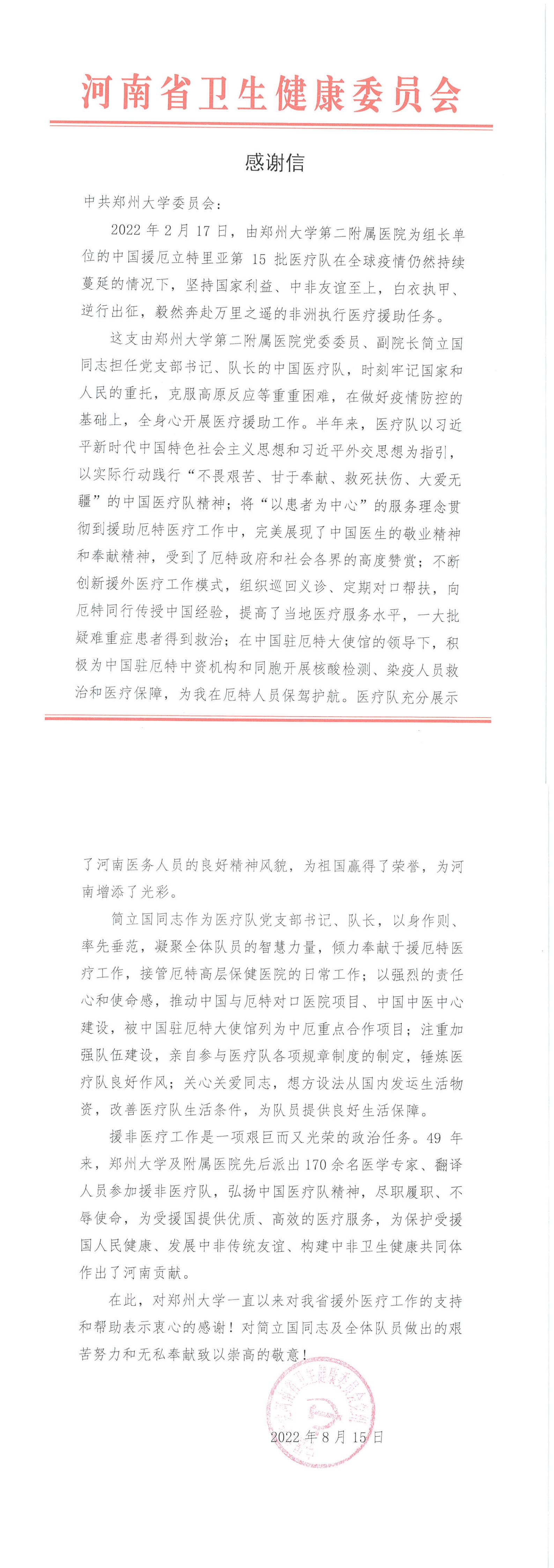 信中指出,第15批援厄医疗队获得了厄立特里亚政府及中国驻厄使馆的高度评价,中国驻厄使馆专门致信河南省卫健委表示感谢。信中表示,2022年2月,中国第15批援厄医疗队面对严峻的新冠疫情,在简立国队长的带领下,不惧艰险、逆行出征、毅然来厄,在尚未完全克服高原反应等困难的情况下,即投入治病救人、共抗疫情的援外医疗工作。半年来,医疗队以习近平新时代中国特色社会主义思想和习近平外交思想为指引,以实际行动践行“不畏艰苦、甘于奉献、救死扶伤、大爱无疆”的中国医疗队精神;将“以患者为中心”的服务理念贯彻到援助厄特医疗工作中,完美展现了中国医生的敬业精神和奉献精神,受到了厄特政府和社会各界的高度赞赏;不断创新援外医疗工作模式,组织巡回义诊、定期对口帮扶,向厄特同行传授中国经验,提高了当地医疗服务水平,一大批疑难重症患者得到救治;在中国驻厄特大使馆的领导下,积极为中国驻厄特中资机构和同胞开展核酸检测、染疫人员救治和医疗保障,为我在厄特人员保驾护航。医疗队充分展示了河南医务人员的良好精神风貌,为祖国赢得了荣誉,为河南增添了光彩。