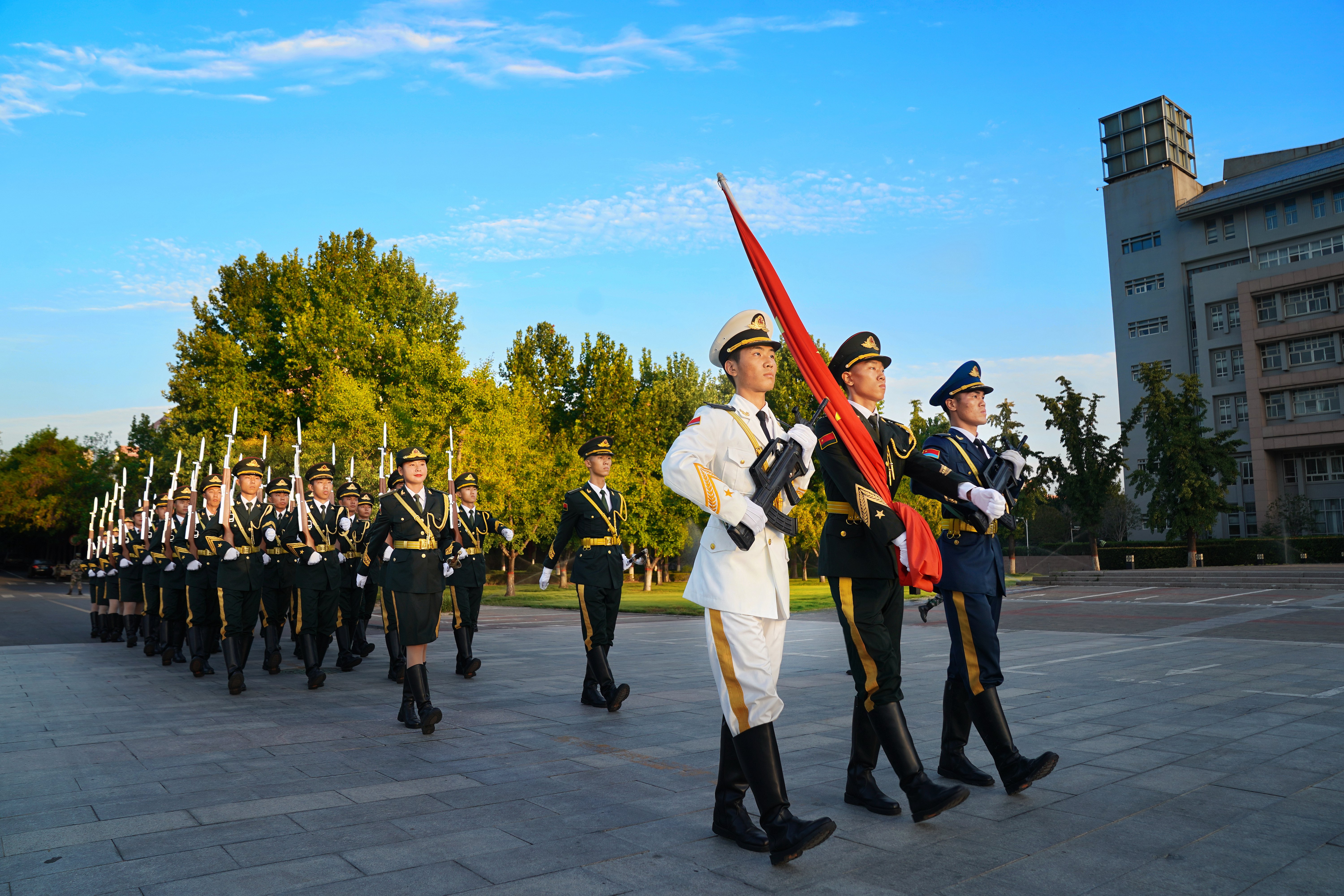 清晨,主校区五星广场上的师生代表早早集合完毕,队列整齐,在祖国各地的同学们提前守在电视、电脑、手机等终端旁,等待这一庄严时刻。6点30分,伴随现场指挥员嘹亮的“标兵就位!”口令下达,升国旗仪式正式开始。国旗护卫队队员身着礼宾服,手执礼宾枪,迈着整齐划一、铿锵有力的步伐,护卫着鲜艳的五星红旗健步入场。全体师生面向国旗肃立致礼。6点46分,伴随着威武雄壮的《义勇军进行曲》,旗手振臂一挥,鲜艳的五星红旗徐徐展开,全体在场师生齐唱国歌,行注目礼,目视五星红旗冉冉升起,在熠熠晨光中迎风飘扬,爱国之情和强国之志在师生们心中激荡。