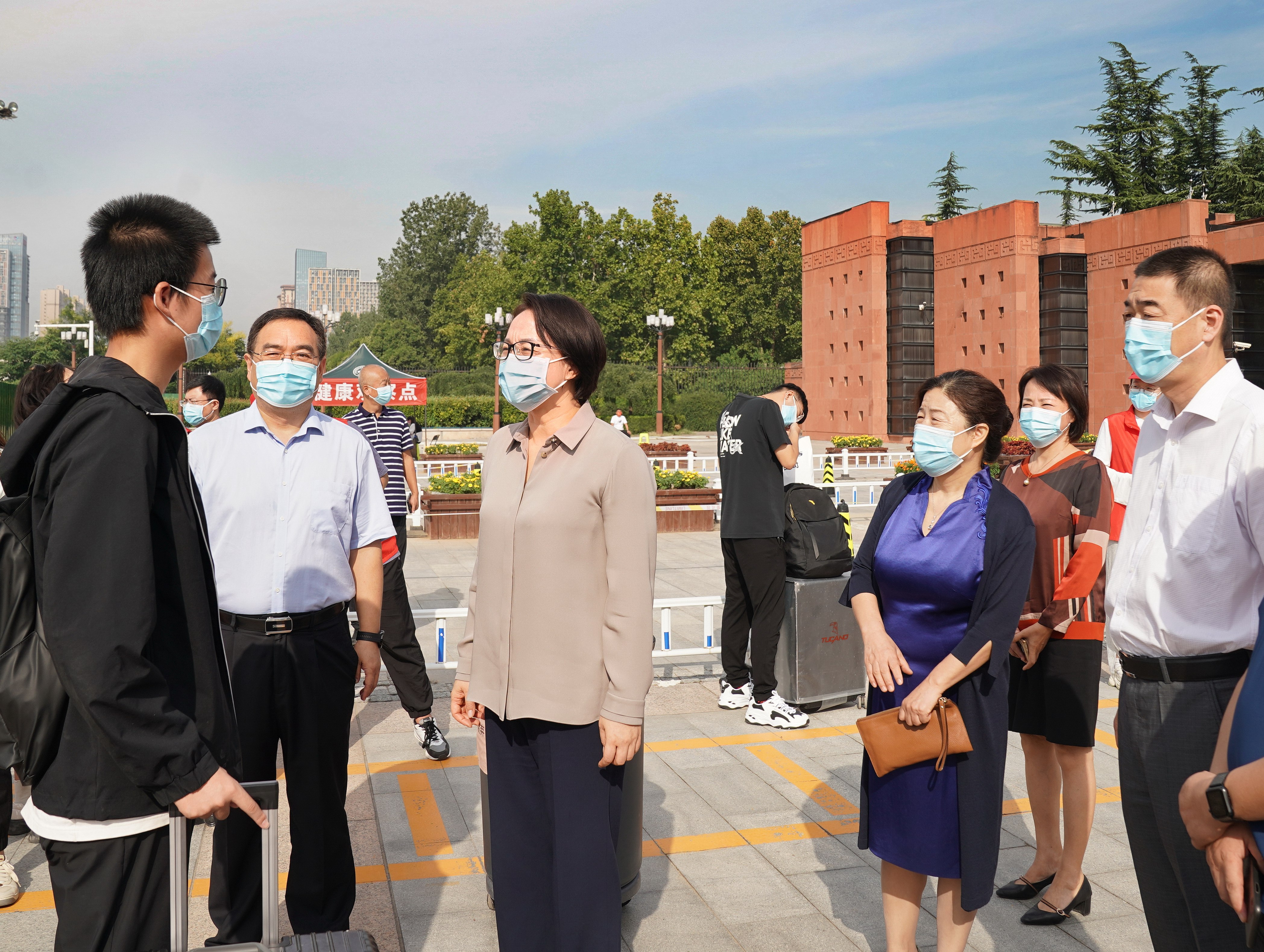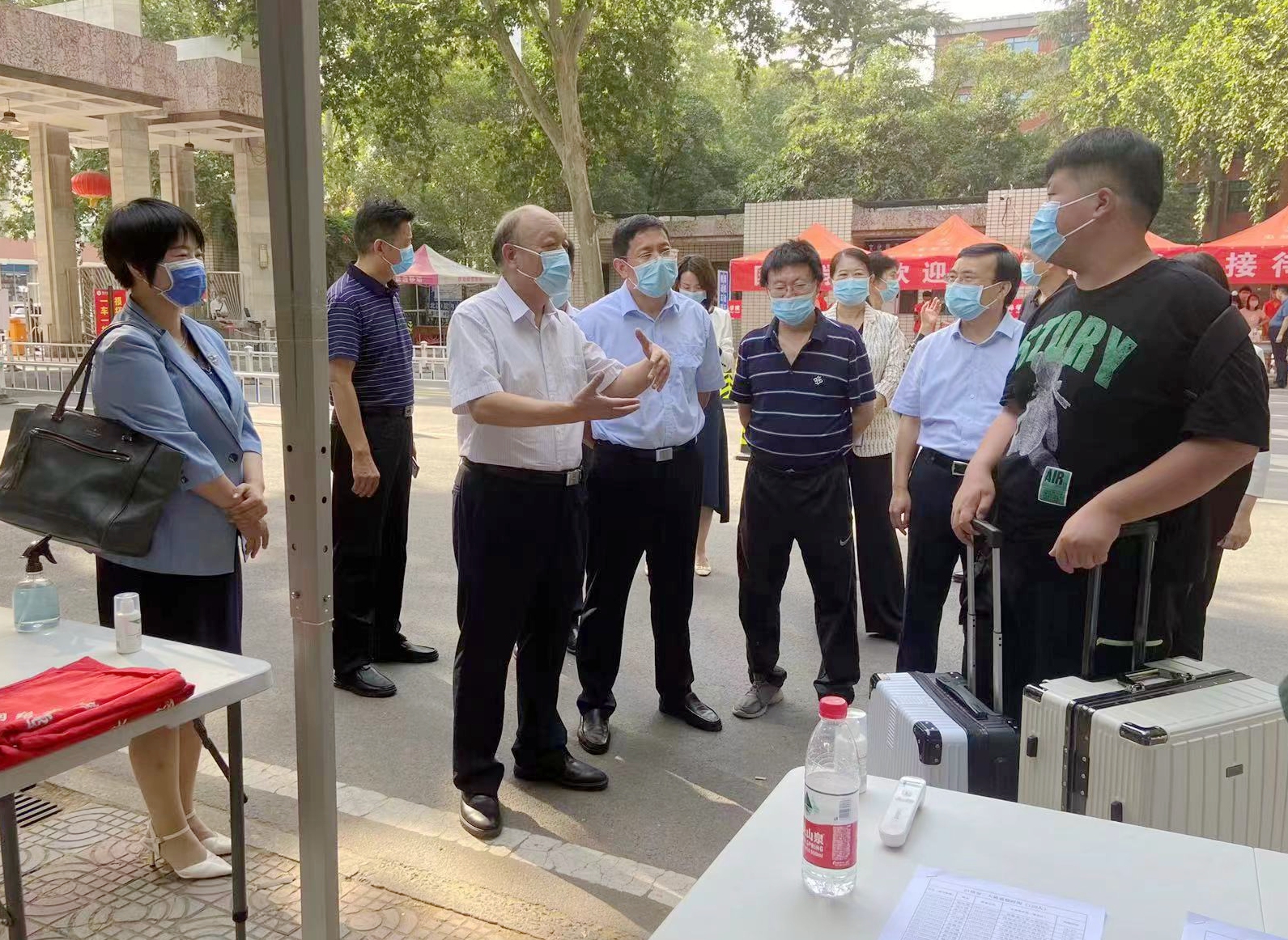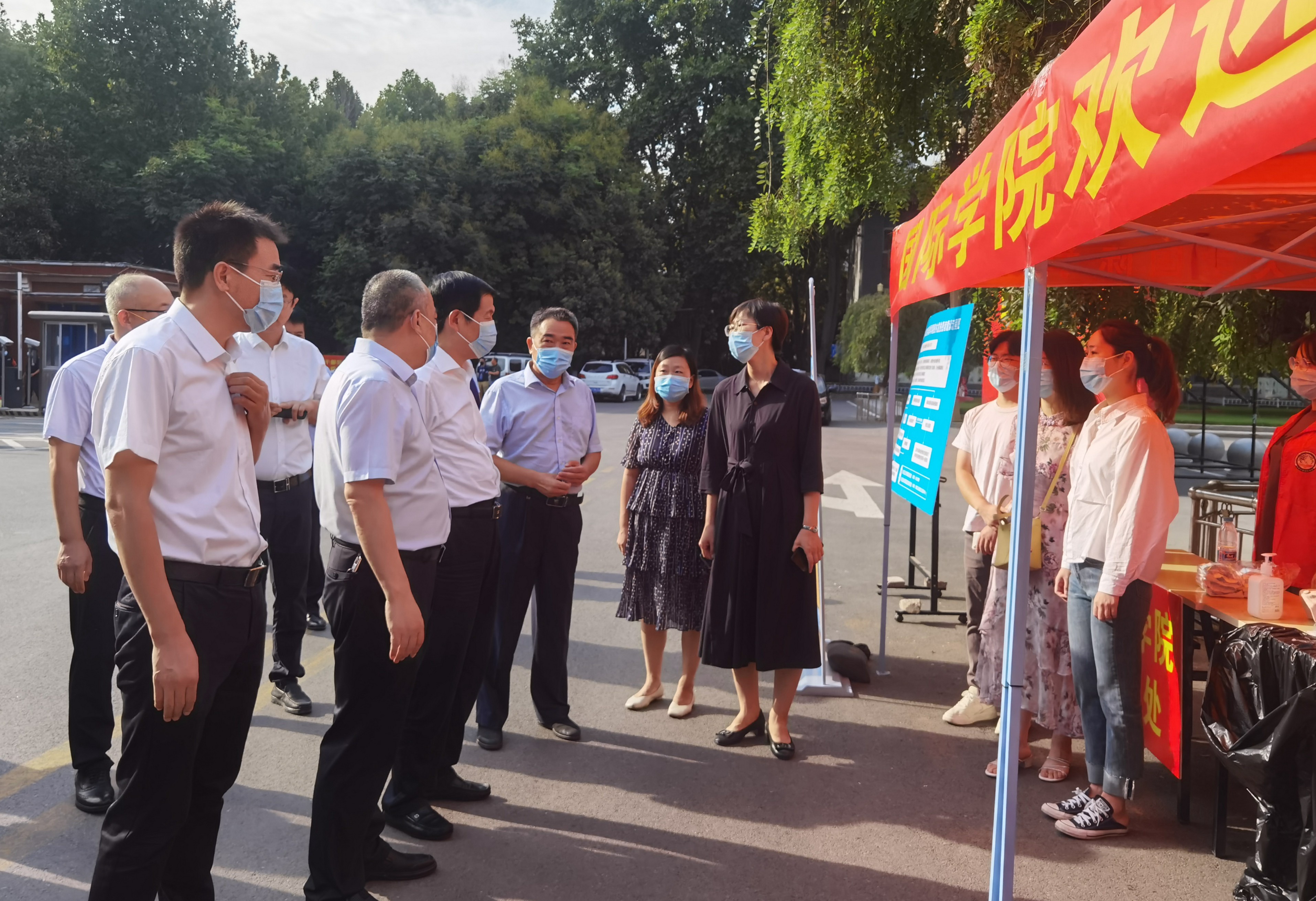 校长李蓬院士、校党委副书记吴宏阳、副校长张倩红在主校区南大门看望慰问返校学生