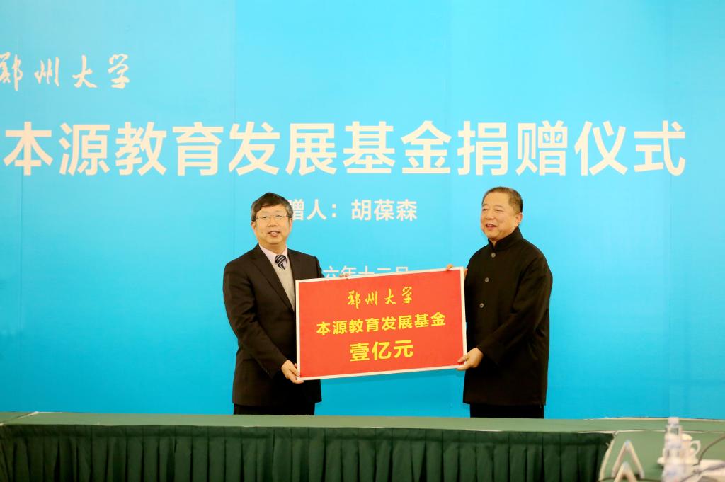 3.2016年12月23日,德赢AC米兰中国官方网站举行本源教育发展基金捐赠仪式,1976级校友、建业集团董事长、河南省本源人文公益基金会创始人胡葆森向学校捐赠1亿元人民币,设立“本源教育发展基金”,支持母校人才培养及发展荷球体育运动。