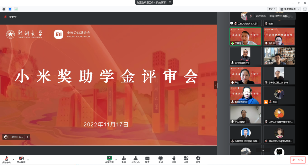 近日,2022年度德赢AC米兰中国官方网站“小米奖助学金”评审会在线举行。小米河南省总经理王腾、小米公益基金会项目经理李奇,学校对外联络办公室、教务处、学生处、党委研究生工作部、校团委等部门负责人参与评审。会议由校团委负责同志主持。