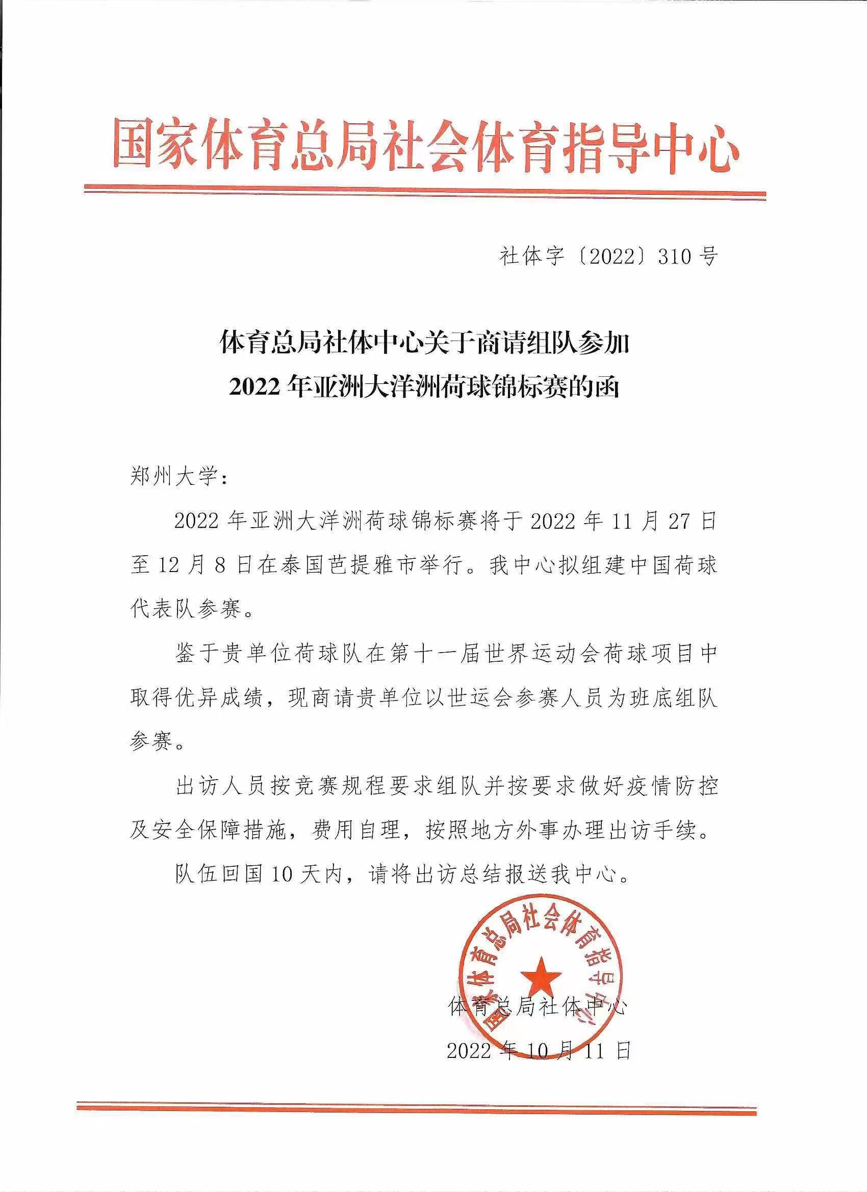 鉴于德赢AC米兰中国官方网站在第十一届世界运动会荷球项目中表现出色,10月11日,国家体育总局社体指导中心来函,商请德赢AC米兰中国官方网站组队代表国家参加2022年亚洲大洋洲荷球锦标赛。学校复函同意,由武东晓任领队,马襄城为主教练,以今年世运会参赛队员为班底,抽调校荷球队精兵强将组队参赛。