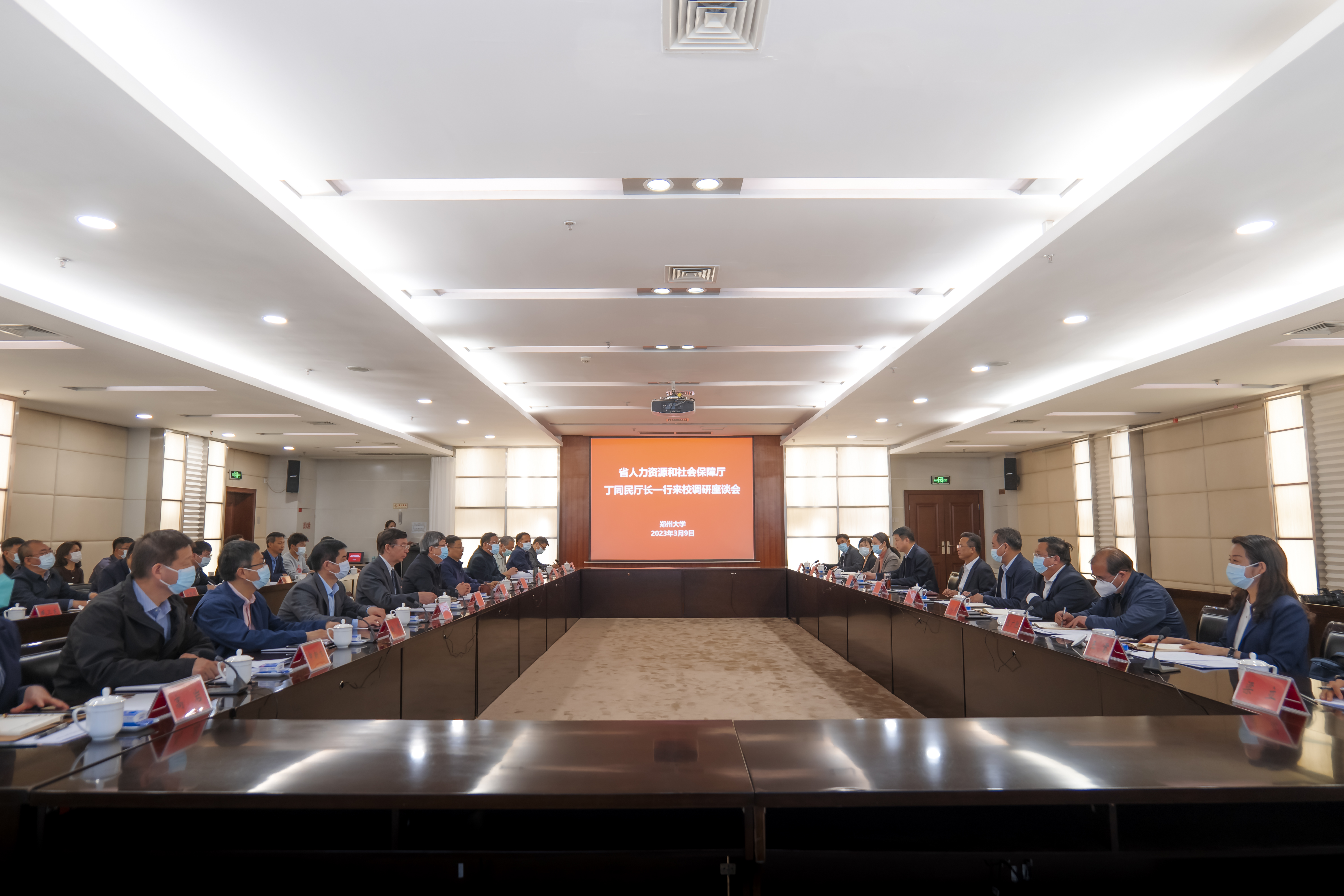 3月9日上午,省人力资源和社会保障厅党组书记、厅长丁同民一行来校调研指导工作。学校召开座谈会,省政协副主席、校党委书记刘炯天院士,校党委副书记、副校长常俊标,副校长、医学院院长董子钢出席,省人社厅有关处室主要负责同志、学校部分职能部门和学院主要负责同志以及博士后代表参加座谈。会议由常俊标主持。