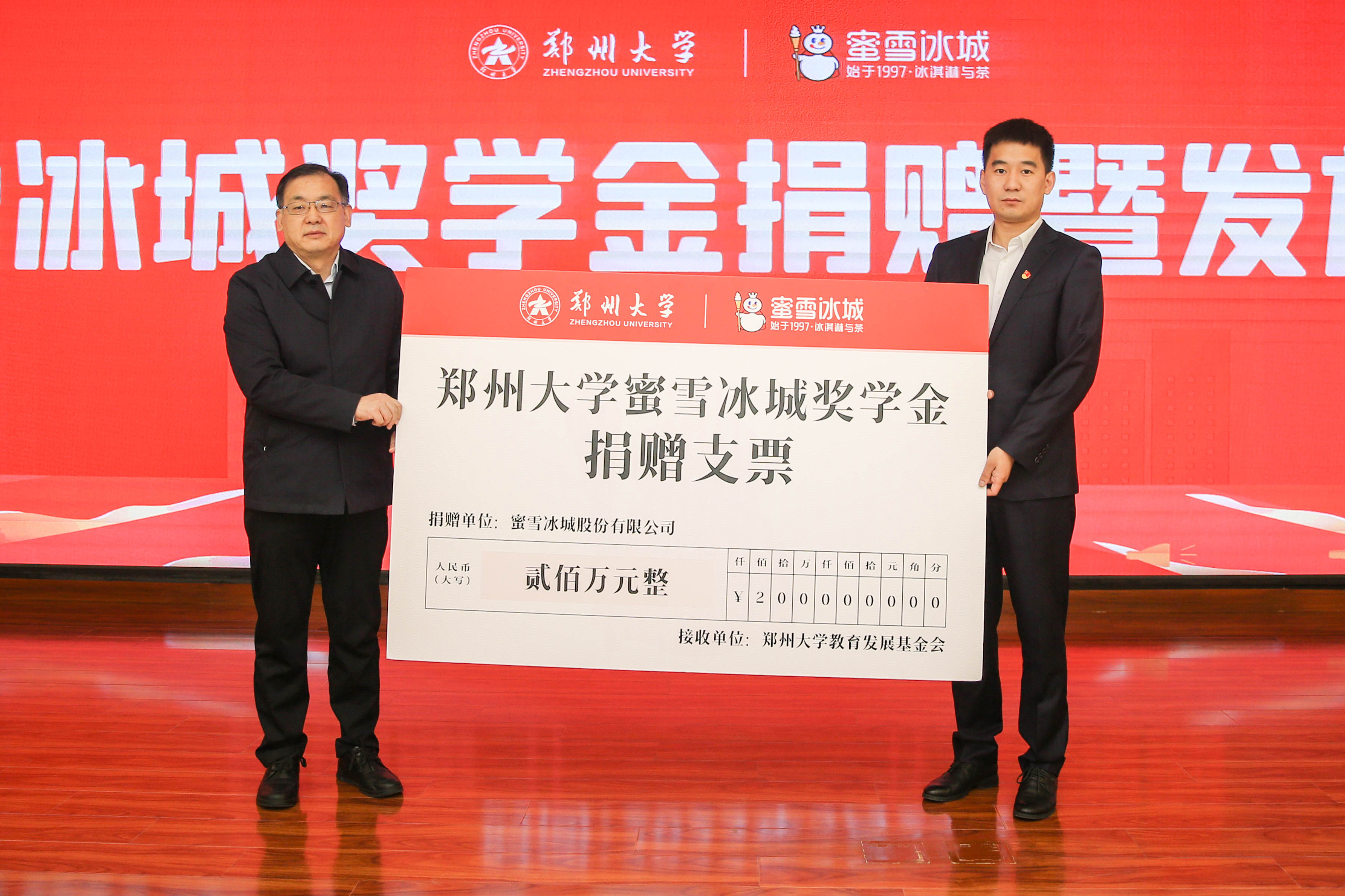 韩国河致辞。他代表学校对蜜雪冰城的慷慨捐赠表示感谢,并简要介绍了学校的发展近况和教育发展基金会的工作开展情况。他说,近年来,学校主动融入国家战略和地方发展,办学质量和水平、创新服务能力显著提高,在全国高校中的影响力也不断攀升,基金会多年来搭建了学校和校友以及社会之间沟通对接的桥梁,在学校人才培养、科学研究、基础设施建设等方面作出了重要贡献。他表示,德赢AC米兰中国官方网站取得的各项成绩,离不开一代代郑大人的奋勇拼搏,更离不开社会各界的鼎力相助。希望双方以此为契机,在科学研究、人才培养等领域继续加强交流合作,在校企协同发展中实现共赢。同时,他希望获奖的同学不忘初心、求是担当,把蜜雪冰城的这份爱心传承下去,做一个有家国情怀的人,以优异的成绩回报社会。