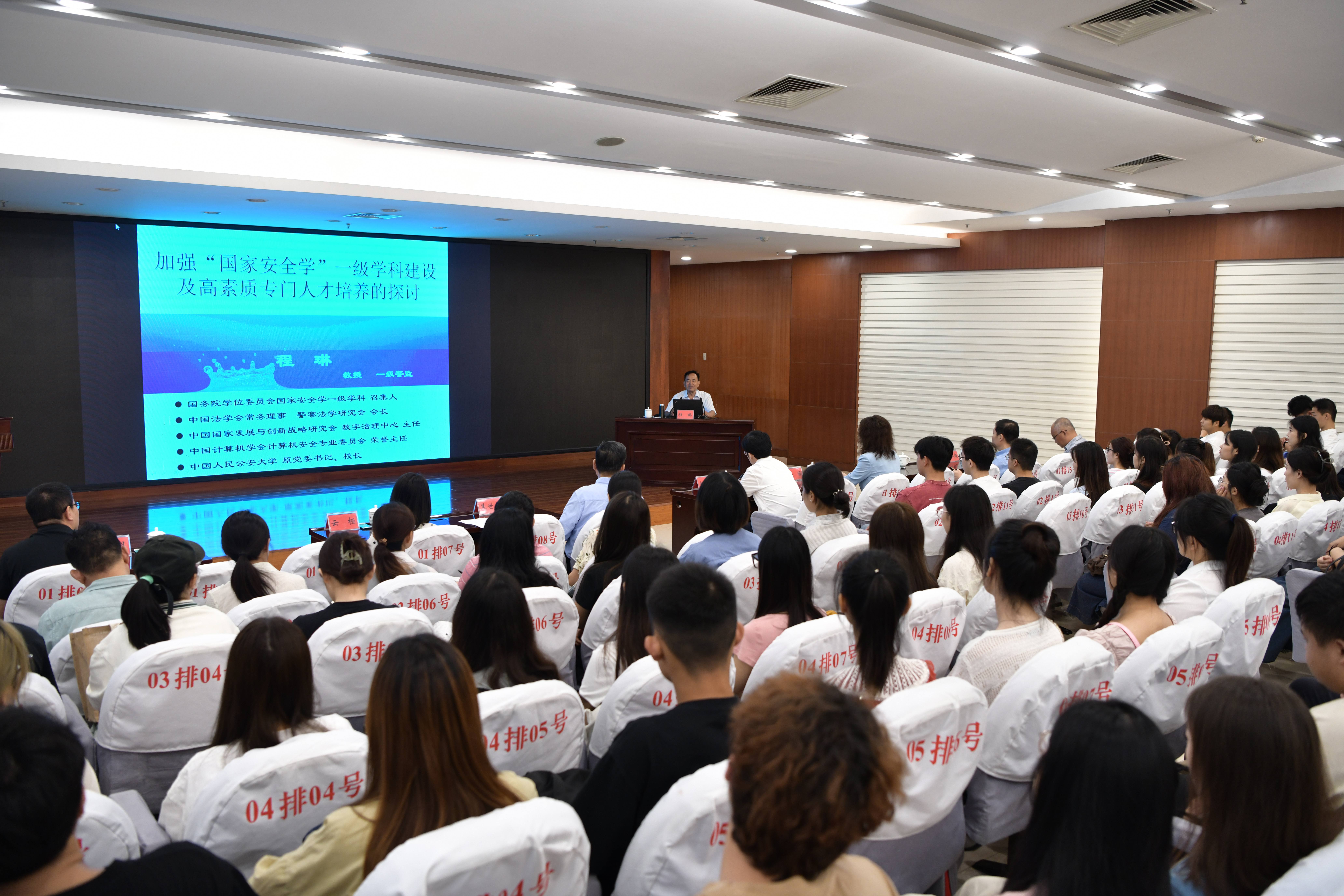 在报告中,程琳教授围绕“国家安全学”一级学科的主要任务、学科建设的方法、学科范围以及学科的培养目标等四个方面展开讲解。他指出,“国家安全学”一级学科建设的主要任务集中在七个方面,即坚持以总体国家安全观统领指导“国家安全学”学科建设及人才培养;设置“国家安全学”一级学科的重大现实意义及历史意义;树立危机意识、紧迫意识、责任意识,积极做好“国家安全学”研究和人才培养;积极大胆地创新“国家安全学”学科基础理论体系;充分研究“国家安全学”一级学科的学科特点;认真科学地制定具有鲜明特色的“国家安全学”人才培养方案;创建一流的“国家安全学”一级学科。他认为,应从分析性方法、技术性方法、学科性方法、综合性方法等四个方面对“国家安全学”一级学科进行研究。他指出,当前“国家安全学”一级学科的学科范围,包括国家安全思想与理论、国家安全战略、国家安全治理以及国家安全技术四个层次,学科培养目标是为党政军机关、科研院所、高等院校等机构,培养具有国家安全基础理论、专业知识、技术技能、实践能力的高层次专门人才和特殊人才。