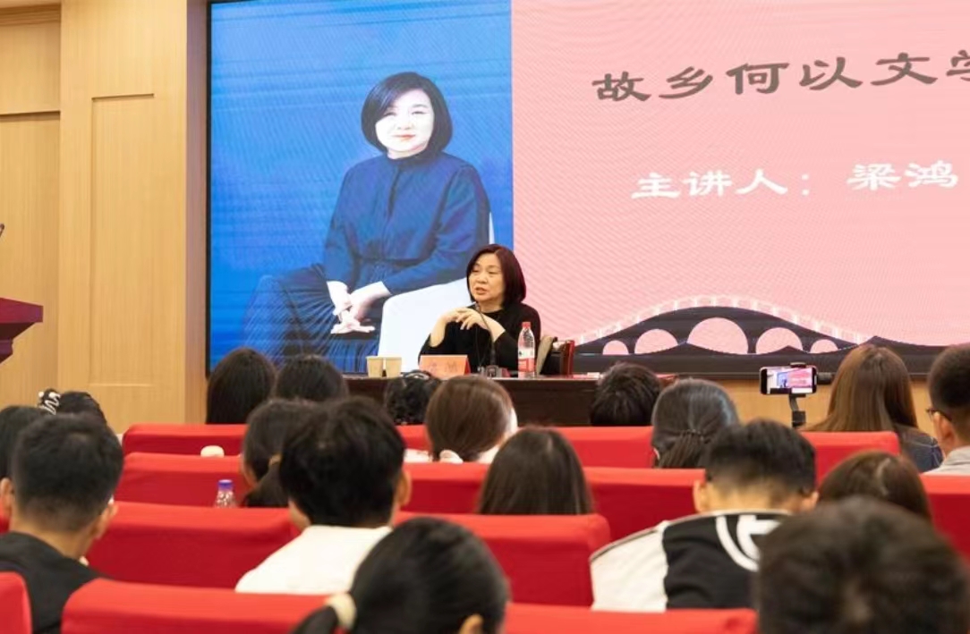 梁鸿通过回忆自己在郑大的研究生生活,强调了时间和空间在文学创作中的重要作用,并由此引入讲座主题“故乡何以文学”。她指出,故乡是一个人最原初的情感寄居地,作家笔下的故乡是文学的故乡,是经过转化、虚构与变形的独属于作家的故乡。她提到自己与河南文学的结缘始于博士论文写作,介绍了自己的童年生活以及梁庄的变迁,探讨了故乡与作家个人情感及作品的关系。她认为,故乡提供的语境和氛围是隐含着整个时代变迁的,作家所要做的就是写出故乡在漫长时间中的变化。谈到年轻人应如何面对文学与生活的关系时,她表示:人的一生能有几年时光潜心读书和思考,是一件非常幸福的事情。梁鸿也对郑大学生寄予殷切期盼,她希望文学能成为托举起生活的翅膀,她期待这双翅膀为同学们的人生提供必要支撑。梁鸿满怀情感的表达,赢得了在场师生的热烈掌声。
