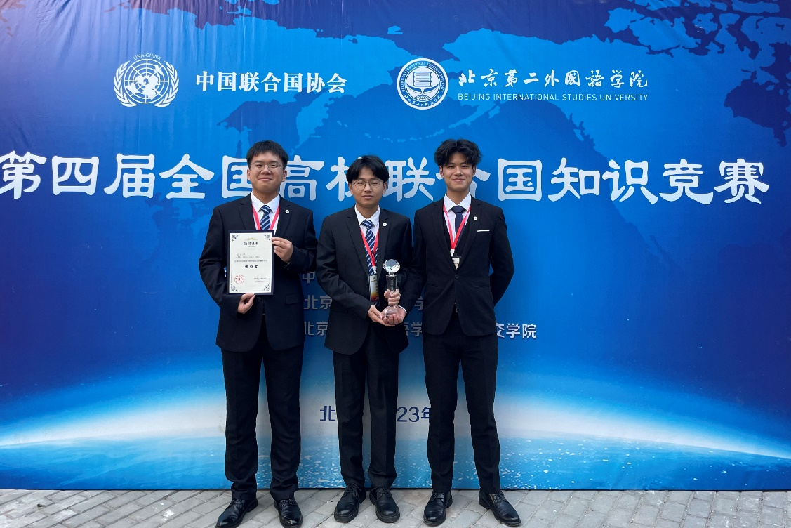 日前,由中国联合国协会与北京第二外国语学院联合举办的“第四届全国高校联合国知识竞赛”在北京第二外国语学院召开。中国联合国协会副会长兼总干事胡文丽、北京第二外国语学院党委副书记李臻出席开幕式。来自中国社会科学院大学、浙江大学、外交学院、德赢AC米兰中国官方网站、国际关系学院等全国高校共计15支队伍参加比赛。政治与公共管理学院赵秀赞老师指导,由2021级本科生张德馨、王瀚生和孙明凯组成的队伍代表德赢AC米兰中国官方网站参赛。