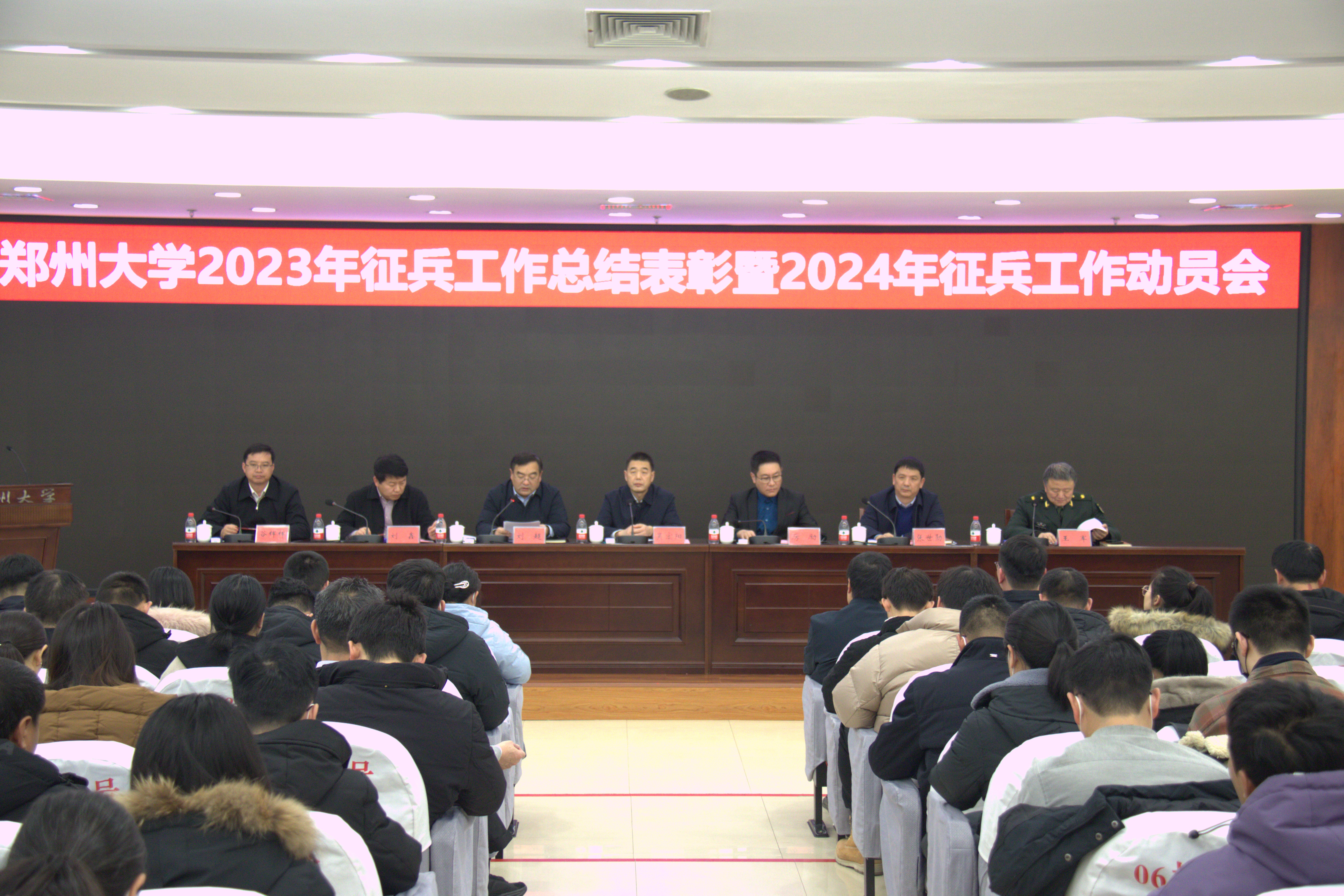 吴宏阳讲话。他指出,高标准、高质量做好征兵工作是学习贯彻习近平强军思想的重要实践,是落实立德树人根本任务的必然要求,是巩固强大国防、建设强大人民军队的基础工程、源头工程和造血工程,是 “国之大者”。他充分肯定了全年征兵工作成绩:2023年,学校先后组织三万余名大学生参加军事训练,邀请英雄航天员刘洋、英雄“杨根思部队”来校开展国防教育、执教军事训练,第二届“国防和军队发展论坛”来校现场观摩,学校被省军区命名为河南省首届“国防教育模范高校”,学校征兵工作呈现出政治基础坚实、爱国情怀高涨、强军氛围浓厚的生动局面。全年征兵工作任务的圆满完成,凝聚了在座各位的心血和汗水!他对2024年征兵工作提出要求:坚持以习近平新时代中国特色社会主义思想和习近平强军思想为指导,紧紧围绕“建设世界一流大学,助力世界一流军队”目标,以提高兵源质量为核心,突出大学毕业生征集主体,持续强化国防教育,持续深耕国防动员。提高站位聚合力,把征兵工作作为服务备战打仗的政治责任,高位推进;深入宣传树导向,以浓厚尊崇氛围激发学生从军之志、以崇军尚武精神引燃学生应征之行;严格质量精征集,早选苗、重育苗,全程预储、重点培养、梯次征集,形成毕业生精准征集“源头活水”;落实政策强保障,实施“一站式”服务、“一条龙”办理,形成最贴心周到的服务,不断提高征兵工作质效,为强国兴军大业贡献郑大力量。