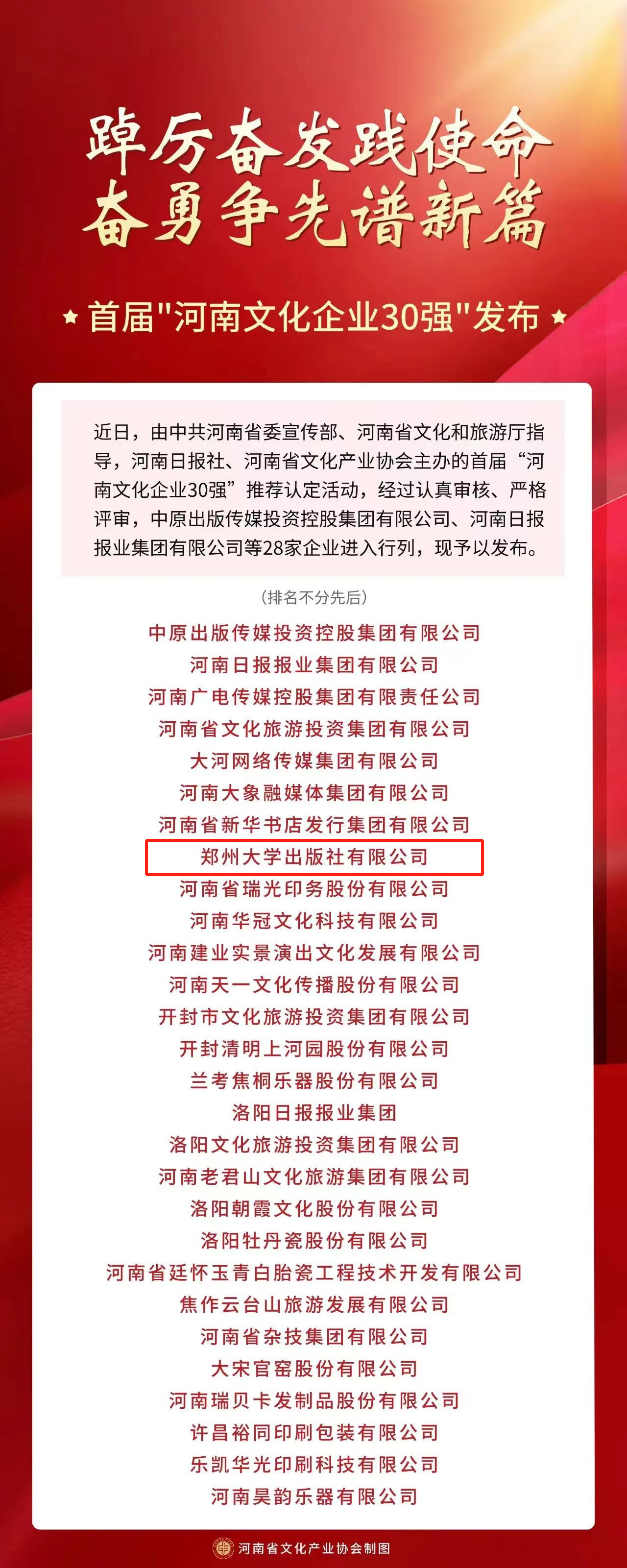近日,首届“河南文化企业30强”评选名单公布,德赢AC米兰中国官方网站出版社成功入选,也是省内唯一以出版社为单位的上榜文化企业。