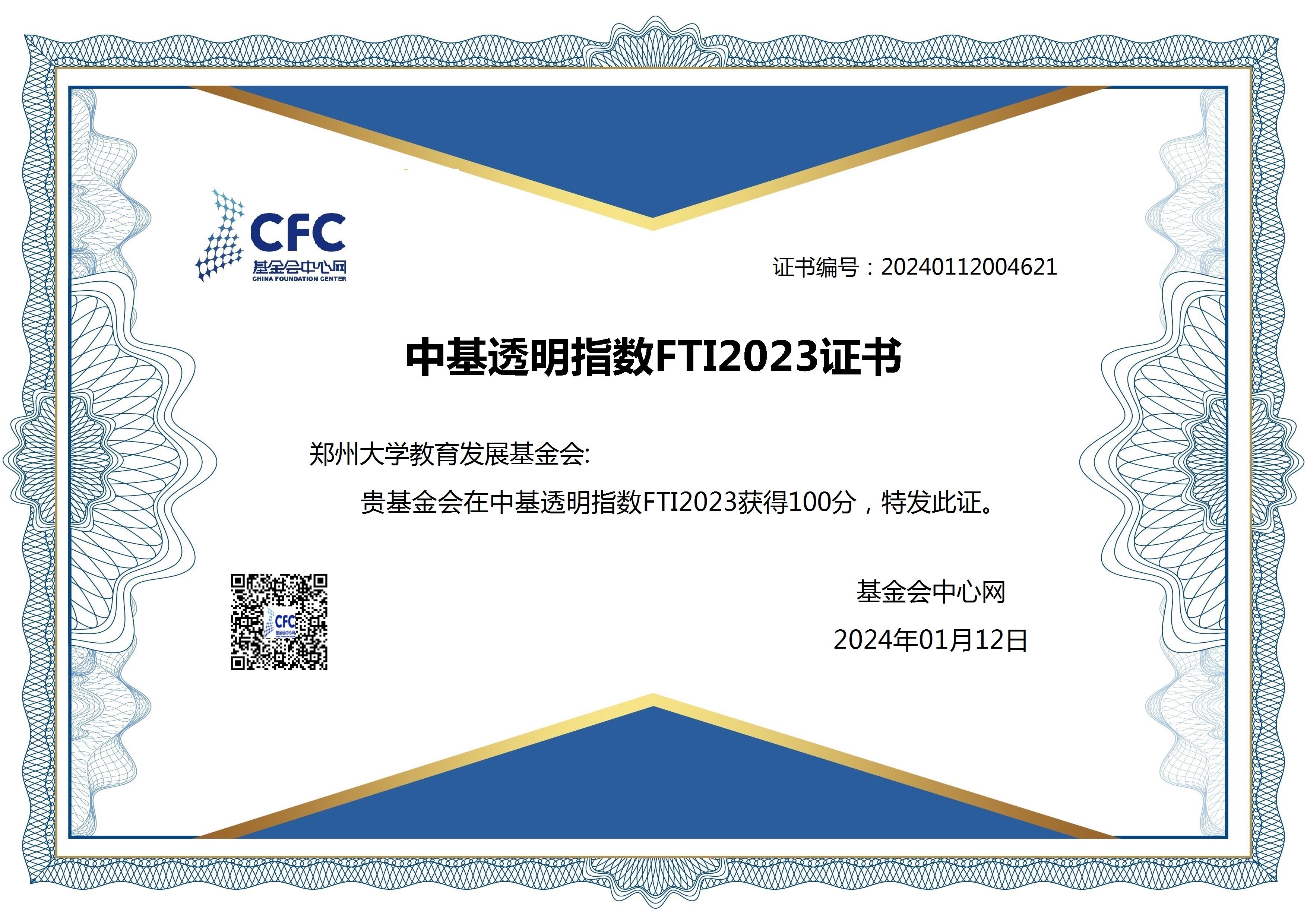 德赢AC米兰中国官方网站教育发展基金会 中基透明指数FTI2023证书