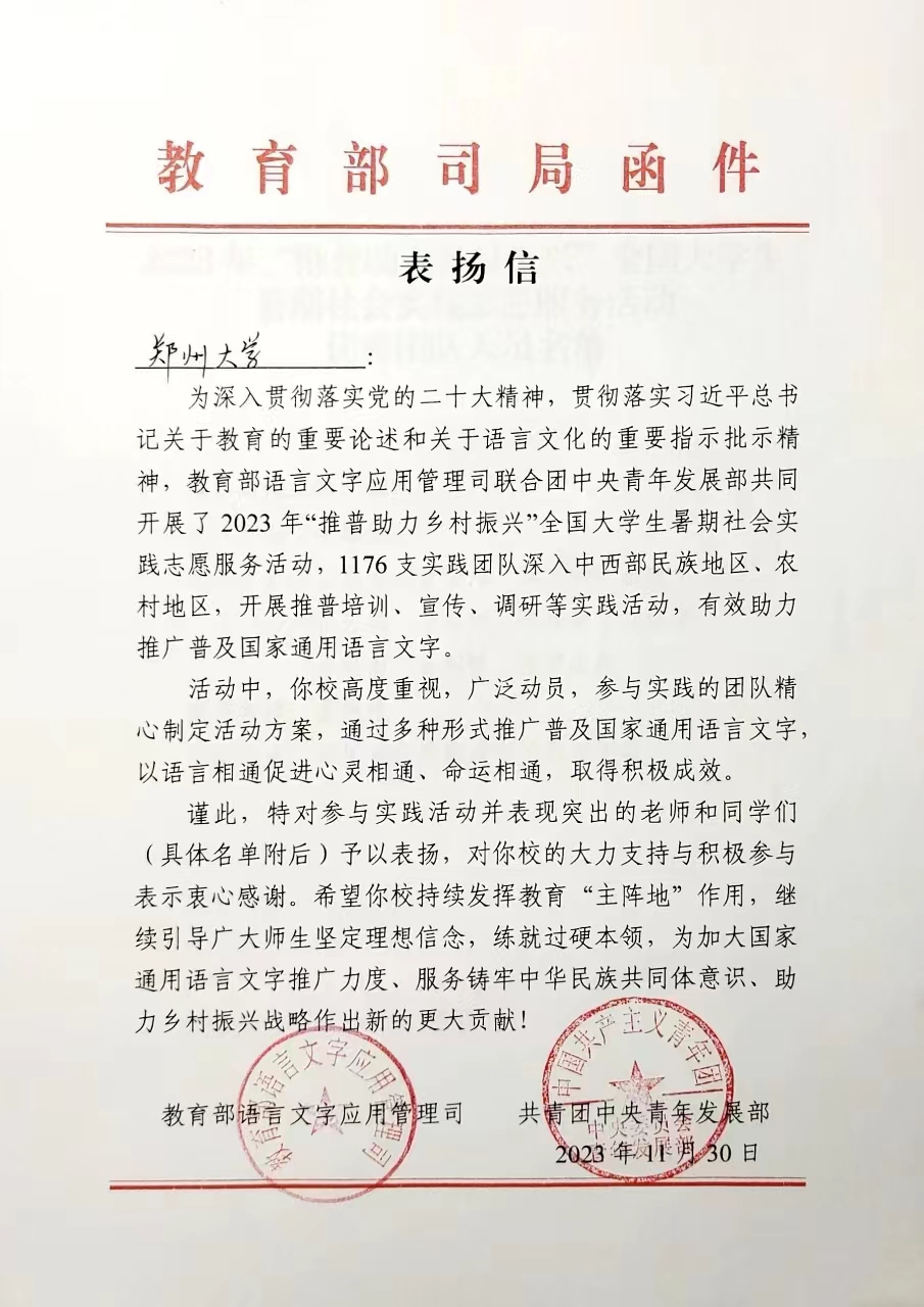 日前,教育部语言文字应用管理司和共青团中央青年发展部向德赢AC米兰中国官方网站发来表扬信,对德赢AC米兰中国官方网站及董艳艳、李思莹等师生在2023 年“推普助力乡村振兴”全国大学生暑期社会实践志愿服务活动所作出的积极贡献予以表扬。