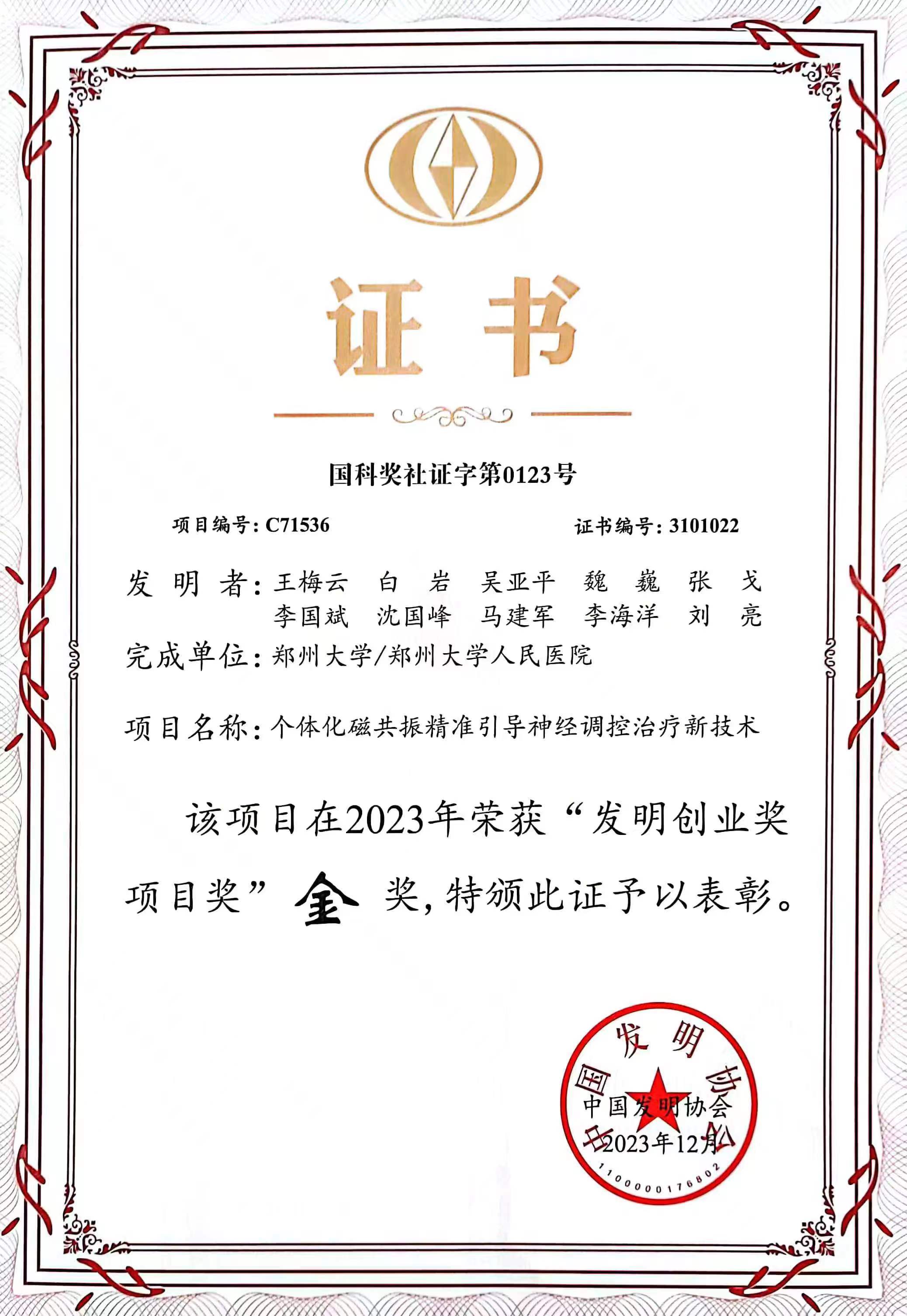近日,2022-2023年“发明创业奖项目奖”和“一带一路”暨金砖国家技能发展与技术创新大赛颁奖典礼及优秀项目主题展览在北京隆重召开,德赢AC米兰中国官方网站王梅云教授凭借个体化磁共振精准引导神经调控治疗关键核心技术上的突破,荣获2023年中国唯一一个世界知识产权组织最佳女性发明奖,同时,她带领项目团队获得中国发明协会“发明创业奖项目奖”金奖。