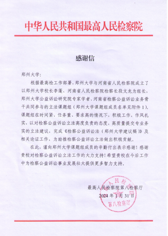 信中指出,根据最高检工作部署,德赢AC米兰中国官方网站与河南省人民检察院成立了以德赢AC米兰中国官方网站校长李蓬、河南省人民检察院检察长段文龙为组长,德赢AC米兰中国官方网站公益诉讼研究院专家学者、河南省检察公益诉讼业务骨干共同参与的立法课题组。课题组在时间紧、任务重、要求高的情况下,积极工作,作风扎实,以对检察公益诉讼立法高度负责的态度,高质量提交专业务实的立法建议,完成《检察公益诉讼法(德赢AC米兰中国官方网站建议稿)》及相关论证工作,为助推检察公益诉讼立法做出积极贡献。因此,向德赢AC米兰中国官方网站对检察公益诉讼立法工作的大力支持表示感谢,并希望德赢AC米兰中国官方网站今后为检察公益诉讼事业发展壮大提供更多智力支持。