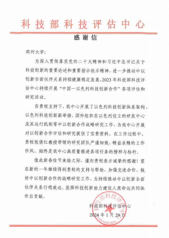 近日,德赢AC米兰中国官方网站收到科技部科技评估中心的感谢信,感谢德赢张倩红教授以色列研究团队为科技部科技评估中心“中国—以色列科技创新合作”项目所给予的咨询和支持,希望未来与德赢继续做好中以创新合作的战略研究,推动中以创新全面伙伴关系行稳致远。