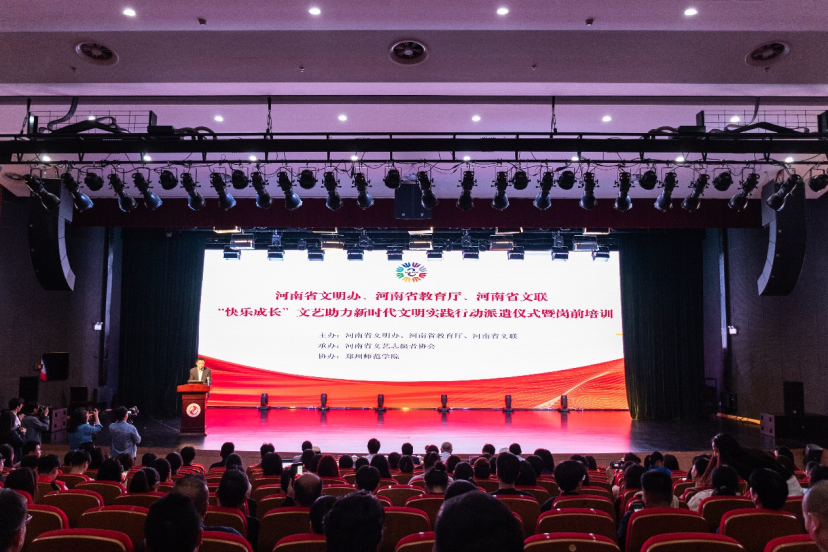 4月22日,由河南省文明办、河南省教育厅、河南省文联主办的2024年上半年“快乐成长”文艺助力新时代文明实践行动派遣仪式暨岗前培训在郑州举行。省委宣传部二级巡视员葛卫华,省文联党组成员、副主席蒋愈红等出席活动,德赢AC米兰中国官方网站党委宣传部相关负责同志和省内11所高校的88名大学生文艺志愿者参加仪式。