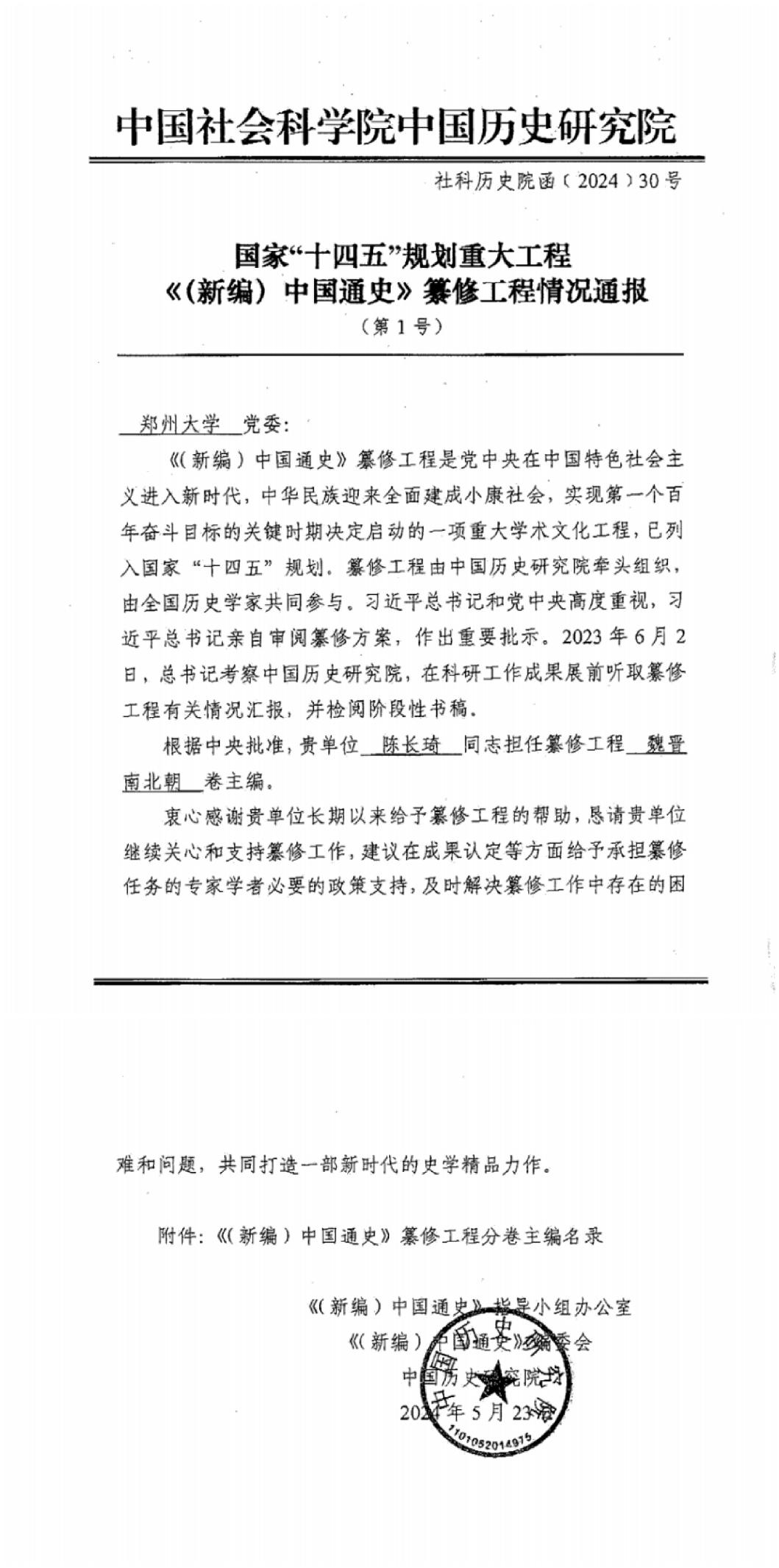 习近平总书记和党中央高度重视《(新编)中国通史》纂修工程。2023年6月2日,习近平总书记考察中国历史研究院,细心听取纂修工程有关情况汇报,并检阅阶段性书稿。经中央批准,德赢历史学院陈长琦教授担任纂修工程《魏晋南北朝卷》主编。