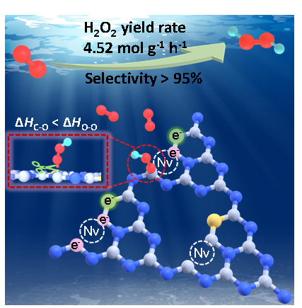 过氧化氢(H2O2)是一种高效的、生态友好的氧化剂,对化学和医疗行业都有重要贡献。高能耗的蒽醌循环过程是目前大规模H2O2工业生产的主要方案,但该工艺存在能效低、残留有机废物再处理以及散装过氧化氢运输存在危险等缺点。双电子氧还原(2e-ORR)电催化转化H2O2因其环境友好的优点和通过设备可现场生产H2O2的能力,为绿色H2O2合成提供了一种前景广阔的替代方法。张佳楠教授团队以掺硫的富缺陷石墨氮化碳(S-Nv-C3N4)材料为模型,提出了一种通过增强超薄二维氮化碳纳米片的铁磁性来促进局部电子极化的策略。该工作不仅成功实现了大批量(实验室制备一次100克)高选择性催化剂的制备技术,并且催化剂产率高达4.52 mol/g/h,累计产生近0.04 mmol/L H2O2(一度电能产生540 g (0.06 mmol) H2O2),显著推动了高产率低能耗H2O2合成新技术的发展。