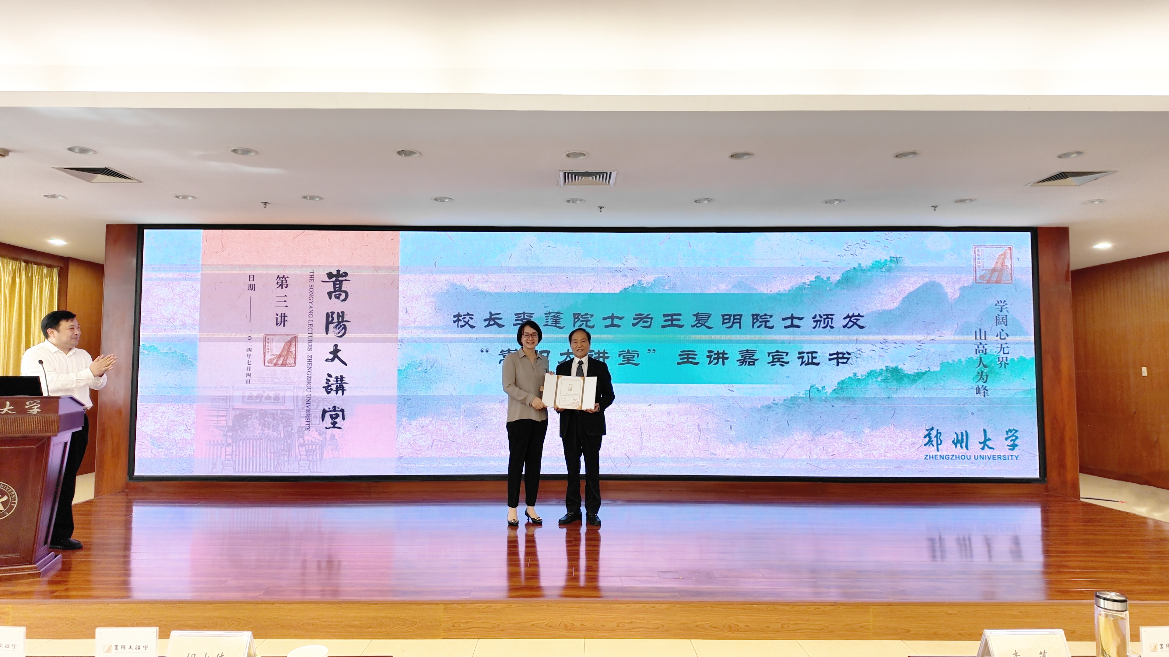 聘任仪式上,李蓬为德赢1977级杰出校友、中国工程院院士、德赢AC米兰中国官方网站水利工程学科首席教授王复明颁发“嵩阳大讲堂”主讲嘉宾证书。