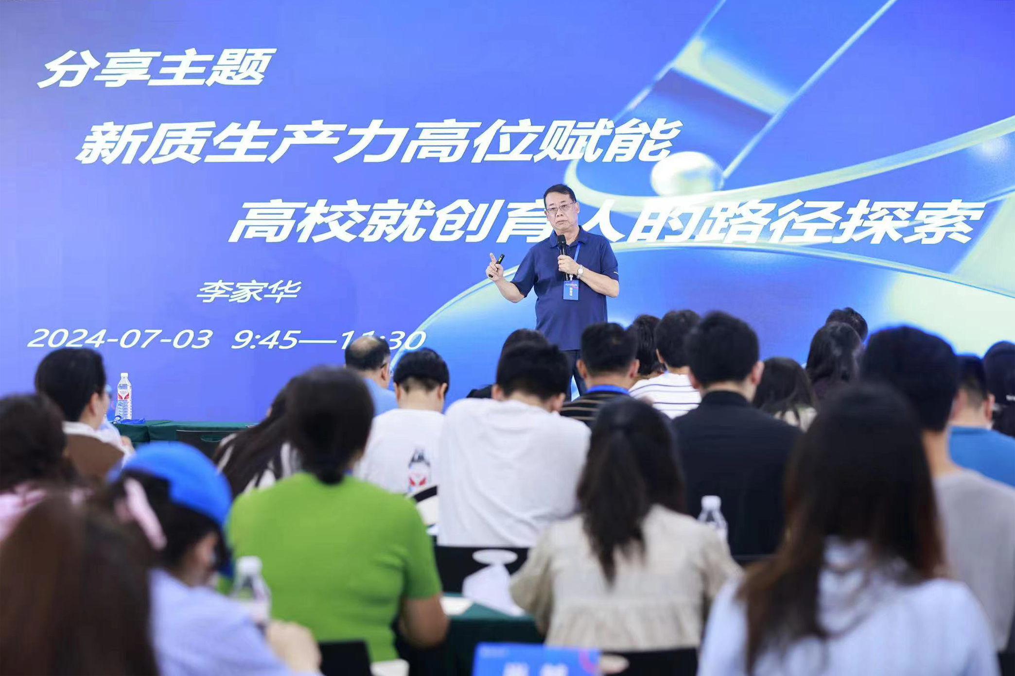 仪式结束后,中国青年政治学院李家华教授以“新质生产力高位赋能高校就创育人的路径探索”为主题开班首讲。据悉,此次培训班为期两天半,特邀4名就业领域专家进行专题授课,课程融入理论剖析、实践运用、案例分享、工作坊互动教学和职业探访等新型教学模式,来自22个学院的67名院系副书记、就业指导老师和辅导员参加培训。
