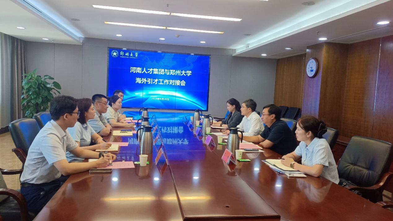8月20日,河南人才集团副总经理付宏坤一行来校洽谈对接海外引才工作。学校召开座谈会,校党委常委、副校长王海杰出席,人事部(党委教师工作部、党委人才办公室)、河南医学院相关负责同志参加座谈交流。