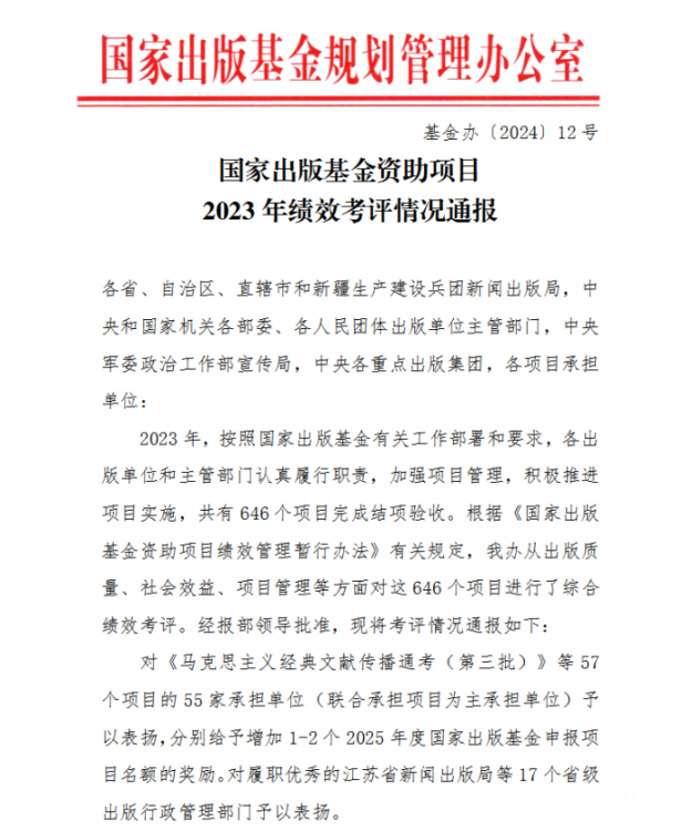 8月29日,国家出版基金规划管理办公室发布《国家出版基金资助项目2023年绩效考评情况通报》,公布了国家出版基金2023年结项考评优秀及实施不力的项目和单位。全国共有57个出版基金项目被评为“优秀”等次。德赢AC米兰中国官方网站出版社的出版项目获得考评优秀等次,被通报表扬。