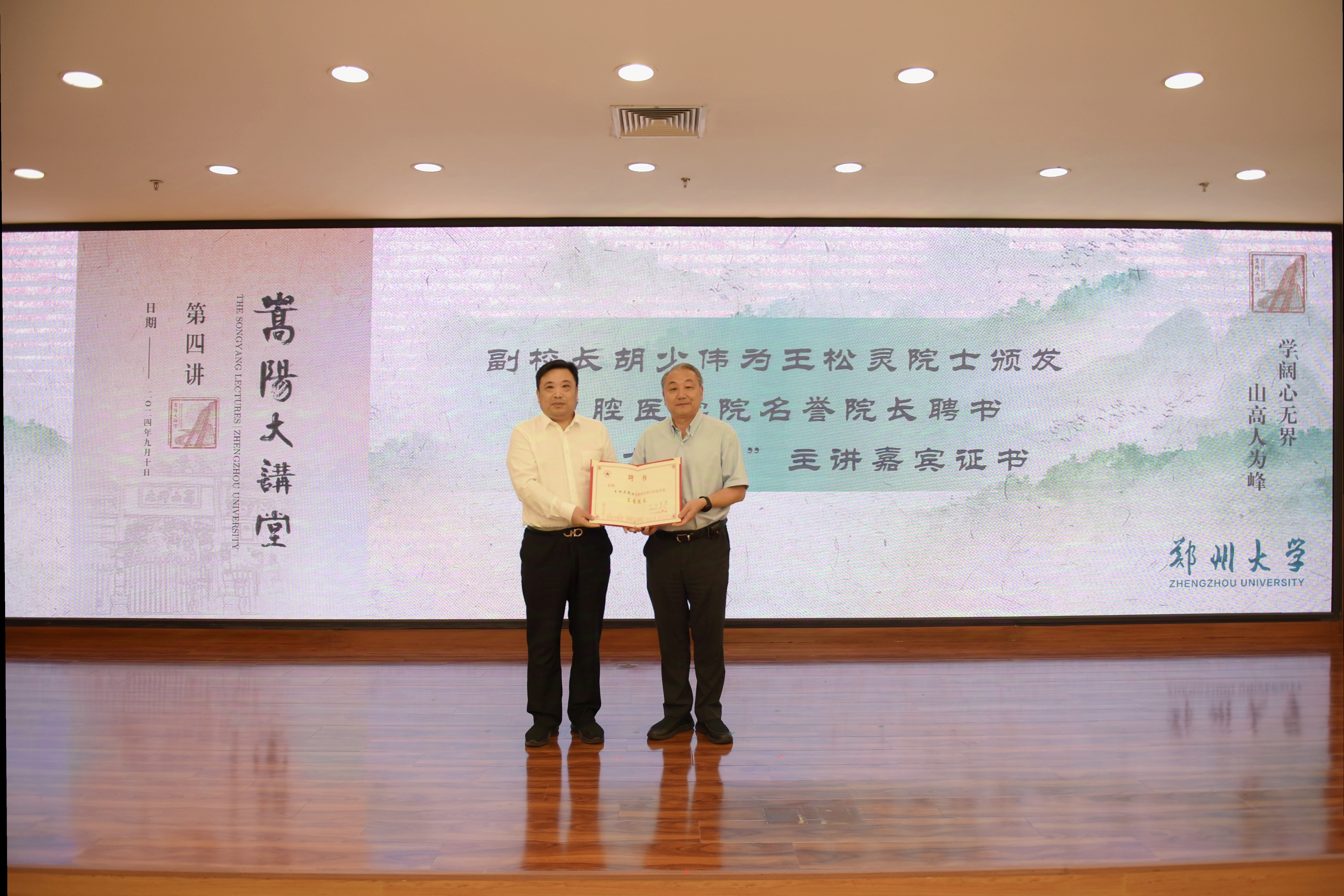 胡少伟向中国科学院院士、中国医学科学院学部委员王松灵颁发“嵩阳大讲堂”主讲嘉宾证书。